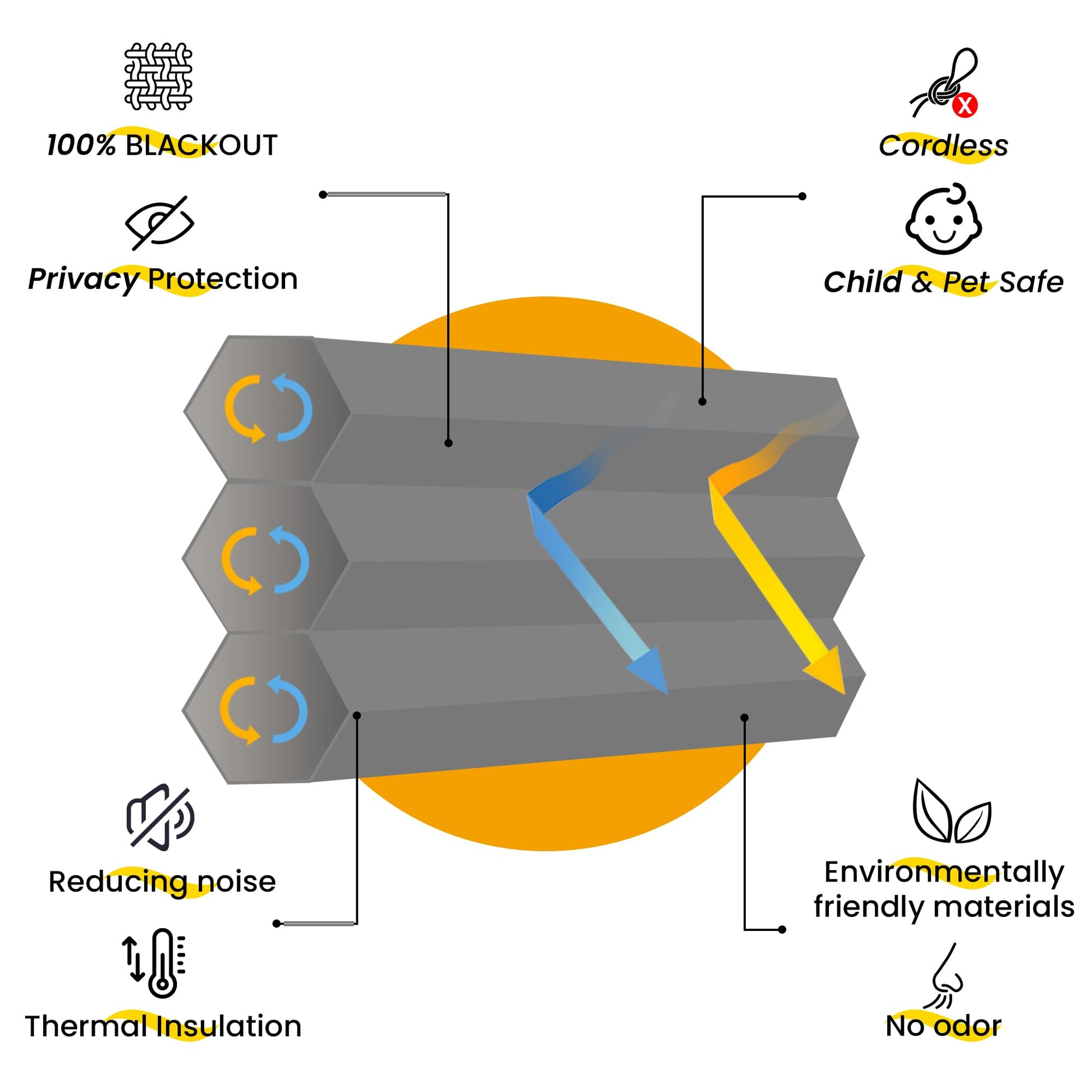 • 100% BLACKOUT and PRIVACY PROTECTION: The Blackout cellular shades uses polyester fiber fabric with special aluminum foil coating inside of the cellular material, which provides effective blackout capabilities,achieving 100% room darkening light blocking effect and providing perfect privacy, very suitable for nap and bedtime