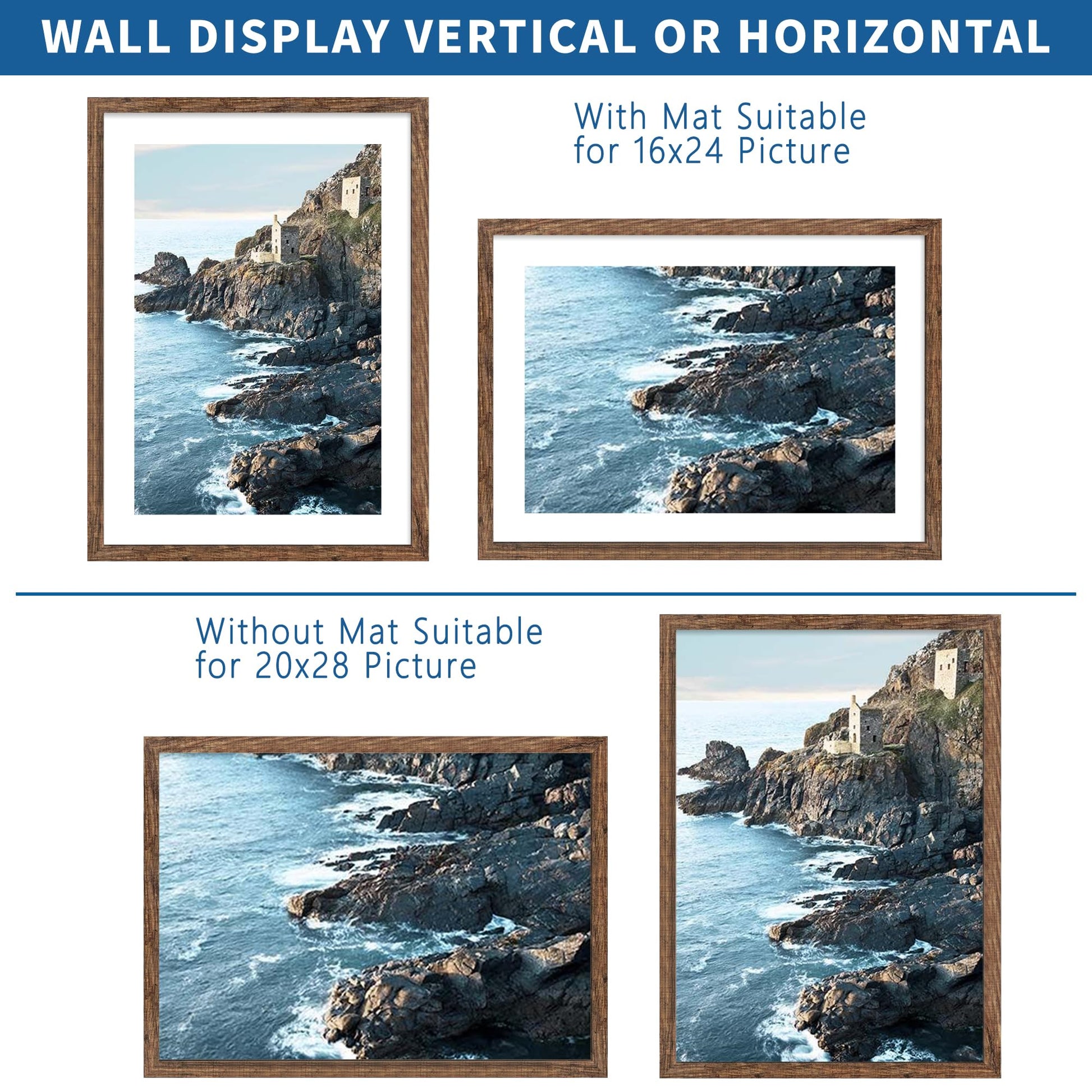 - 【FIT FOR 2 SIZES PHOTOS】This poster frames 20 x 28 overall dimension is 21.7x29.7x0.7 inches, fits 20x28 picture without mat, 16x24 picture with mat. The actual mat opening was designed slightly smaller than photo itself in order to hold it steadily while not a defect.