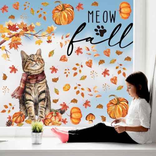 Horaldaily 60 PCS Fall Thanksgiving Window Cling Sticker, Pumpkin Leaves Cats Home Party Supplies Shop Window Glass Display Decoration