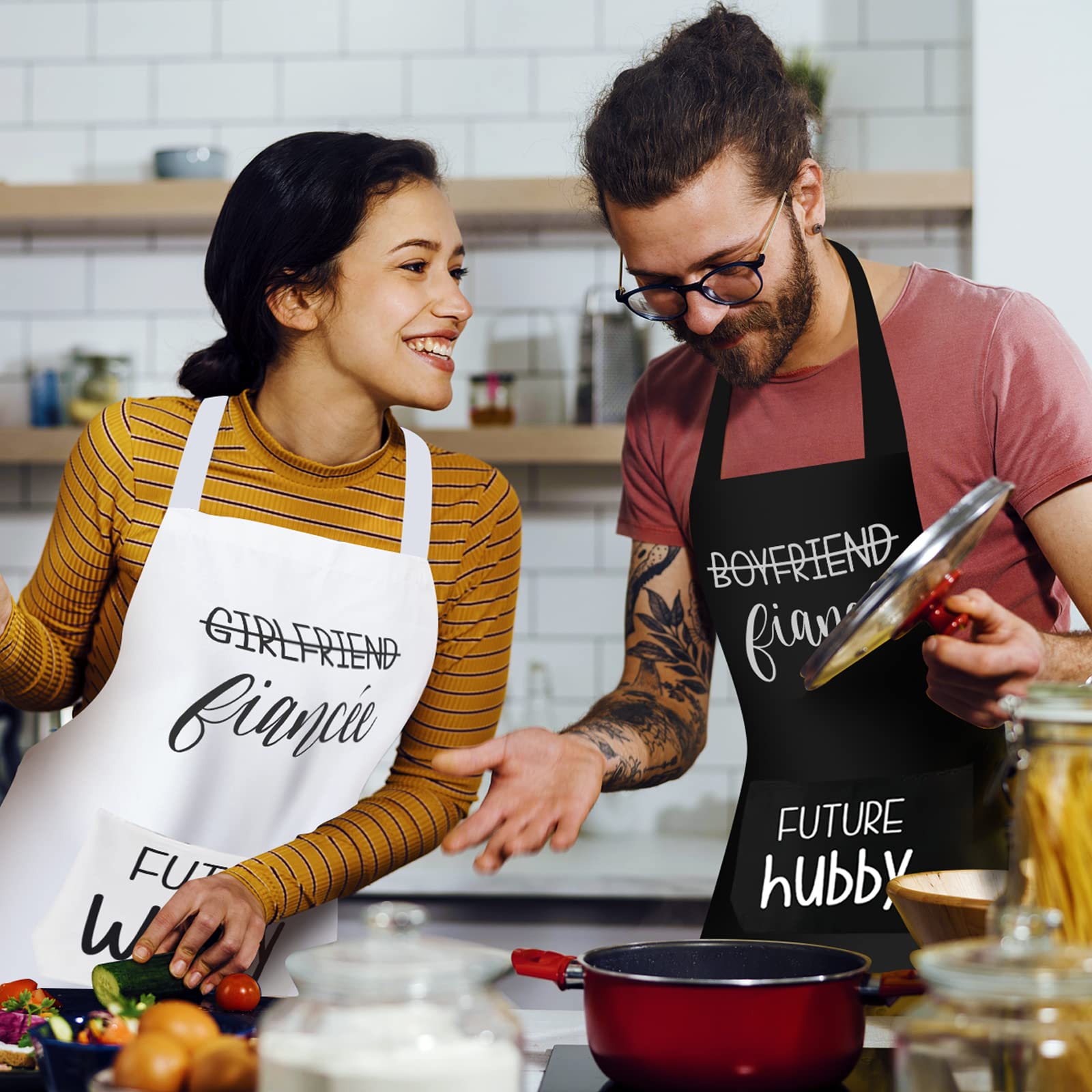 - ROMANTIC GIFT FOR COUPLES: A gift set that fiance and fiancee will absolutely love,it contains set of 2 apron are printed with boyfriend girlfriend Fiancé and Fiancée , and also the design of future wifey and hubby on the apron, to celebrate the newest milestone in the love story of a couple you cherish.