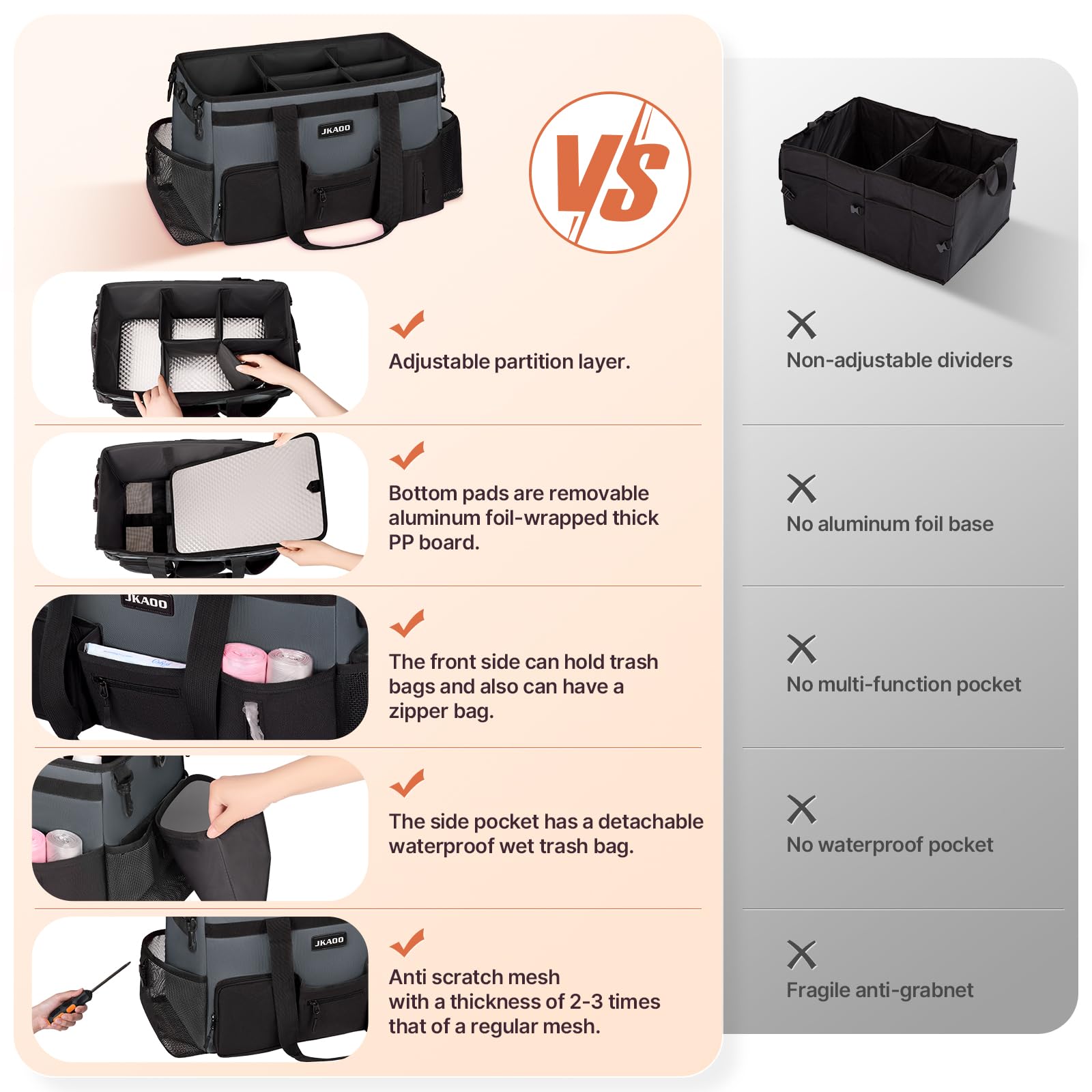 - 【Premium Large Capacity Cleaning Kit】 The cleaning kit measures 16"L x 9"W x 10"H (40.64 x 22.86 x 25.40 CM), about 15% larger in capacity than other cleaning kits. It features 2 hooks on each side and back, totaling 6 hooks for increased storage space. The soft yet sturdy anti-scratch mesh pockets on each side are widened to 2.4in (6CM) and come with clips and a detachable waterproof wet trash bag, allowing you to collect trash on the go (In Patent)