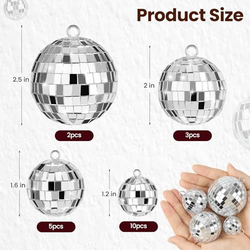 - Value Pack: You will get 20pcs disco ball decorations in 4 different diameters, including 2 pieces of 2.5 inch, 3 pieces of 2 inch, 5 pieces of 1.6 inch and 10 pieces of 1.2 inch, different sizes can meet your various decorating needs