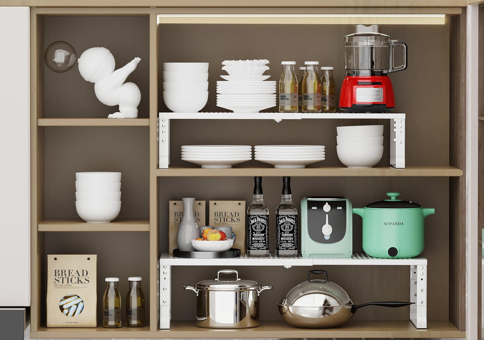 - ⭐【Multi-purpose Spice Shelf for Cabinet】: This adjustable kitchen counter stand shelf instantly create additional storage space. Perfect for any pantry or for placing dishware on, they can be placed inside a cabinet closets, pantry cupboards, on a kitchen countertop or under a sink. You may use the shelf as a cabinet organizer for plates, bowls, snacks, books, magazines and whatsoever.