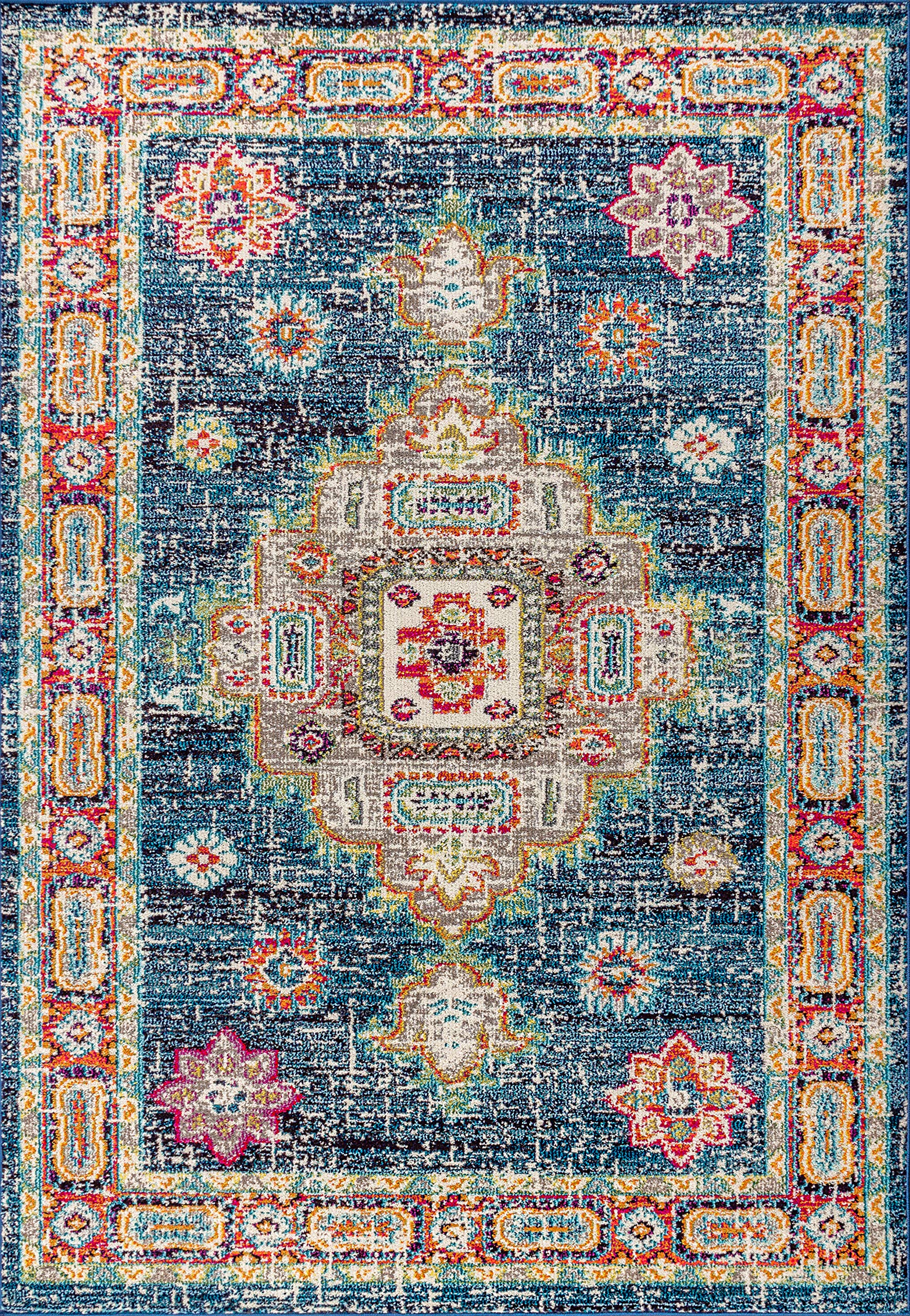 Details: Whimsical in color, the traditional framed medallion design on this bohemian rug adds a tasteful splash of color to any style of décor. Whether for a high traffic space like a living room or dining room, or a private space like a bedroom or bathroom, the durability and style combine to create the perfect floor covering. In shades of navy, red, aqua, and ivory; this rug is a stunning accent for any space.