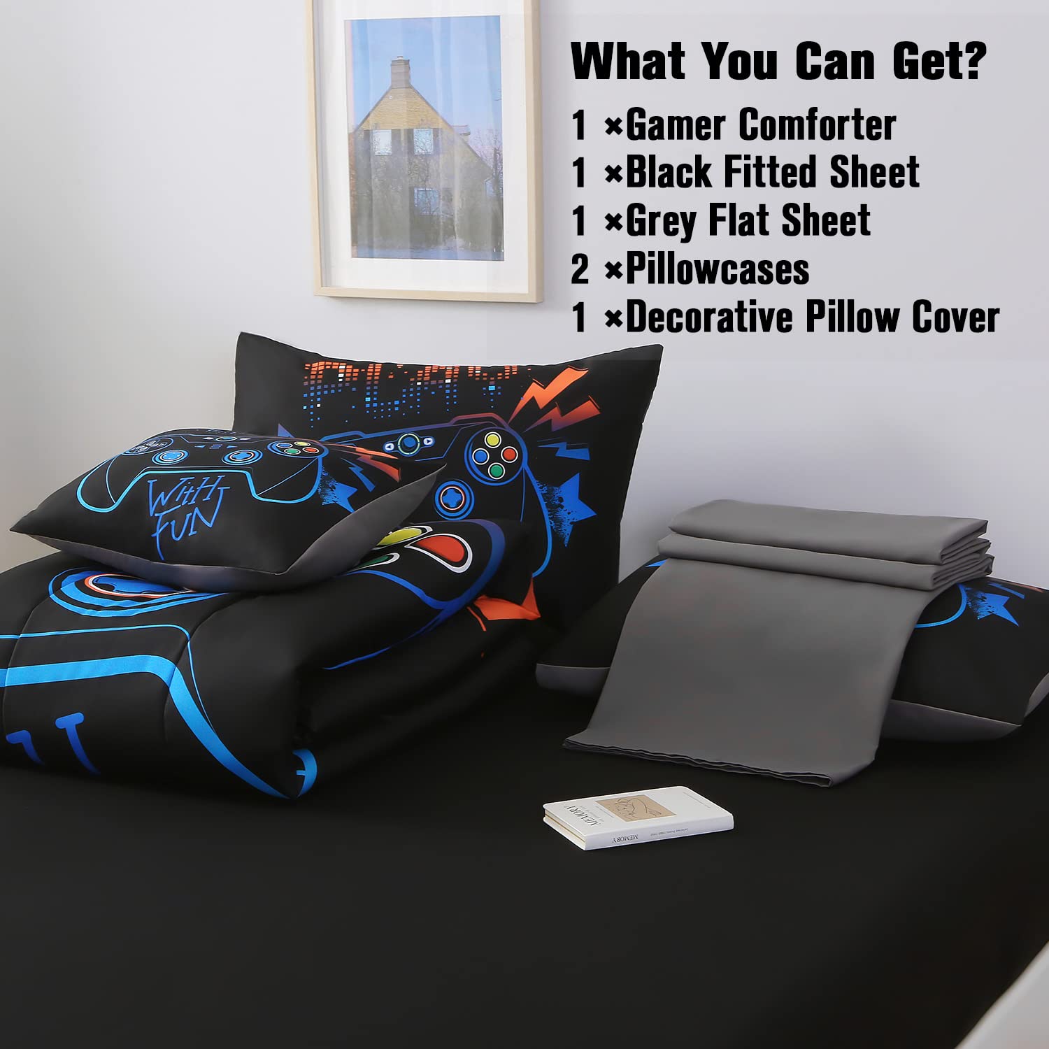 - 【Perfect Gift Choice】The 6 piece bad in a bag full gamer comforter is perfect for decorating any bedroom, kids room, guest room, dorm, playroom, RV or vacation home. Great gift for boys, girls and kids on Birthday, Thanksgiving , Christmas and Valentine's Day. It is not only a bedding comforter, but also a great gift idea for teen boy kids adults.