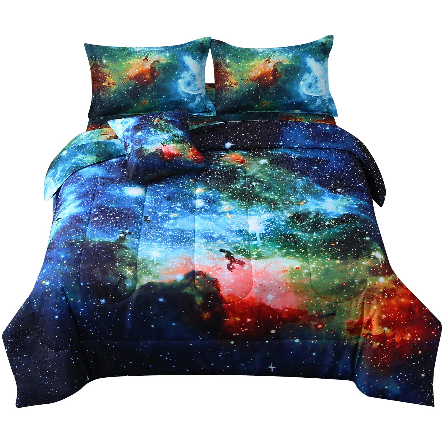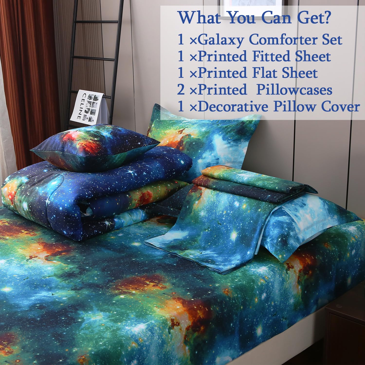 - 【Full Set Matching】Galaxy comforter set contains all the necessary bedding, such as quilts, sheets and pillowcases, each of which perfectly matches the theme pattern, making it easy to create a unified space theme bedroom without the need to purchase other decorations.1 Twin Comforter: 68"x90", 1 Fitted Sheet: 39"x75"+16", 1 Flat Sheet: 66"x96", 2 Envelope Pillowcases: 19"x29", 1 Cushion Cover: 18"x18", perfect for a twin size bed.