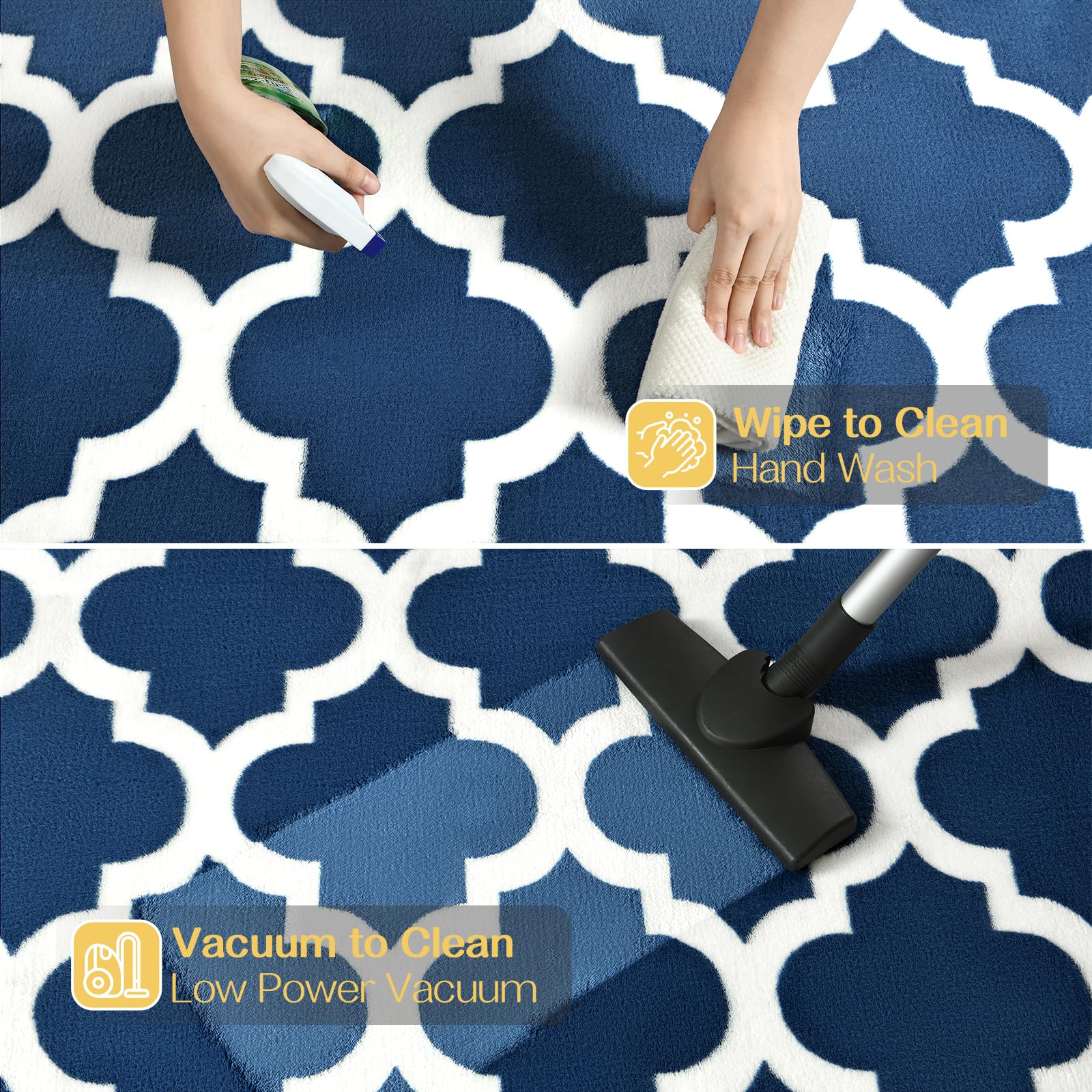 - 【Tips on Daily Care】The low pile polyester fur on rugs for bedroom makes it easy for daily cleaning. You could simply shake off the navy blue area rug outside, or sponge down the nursery rug with wet cloth for a quick cleaning. As for deep cleaning, machine wash is available with cold water on gentle cycle. However, we highly recommend that you should use a low-power vacuum to vacuum the large rug, or hand wash the bedroom rug for long-term usage