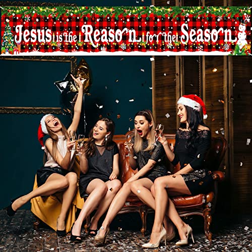 Large Jesus is The Reason for The Season Decorations Banner Holy Nativity Christmas Yard Banner Red Buffalo Plaid Religious Hanging Banner Backdrop for Xmas Winter Holiday Party Indoor Outdoor Decor