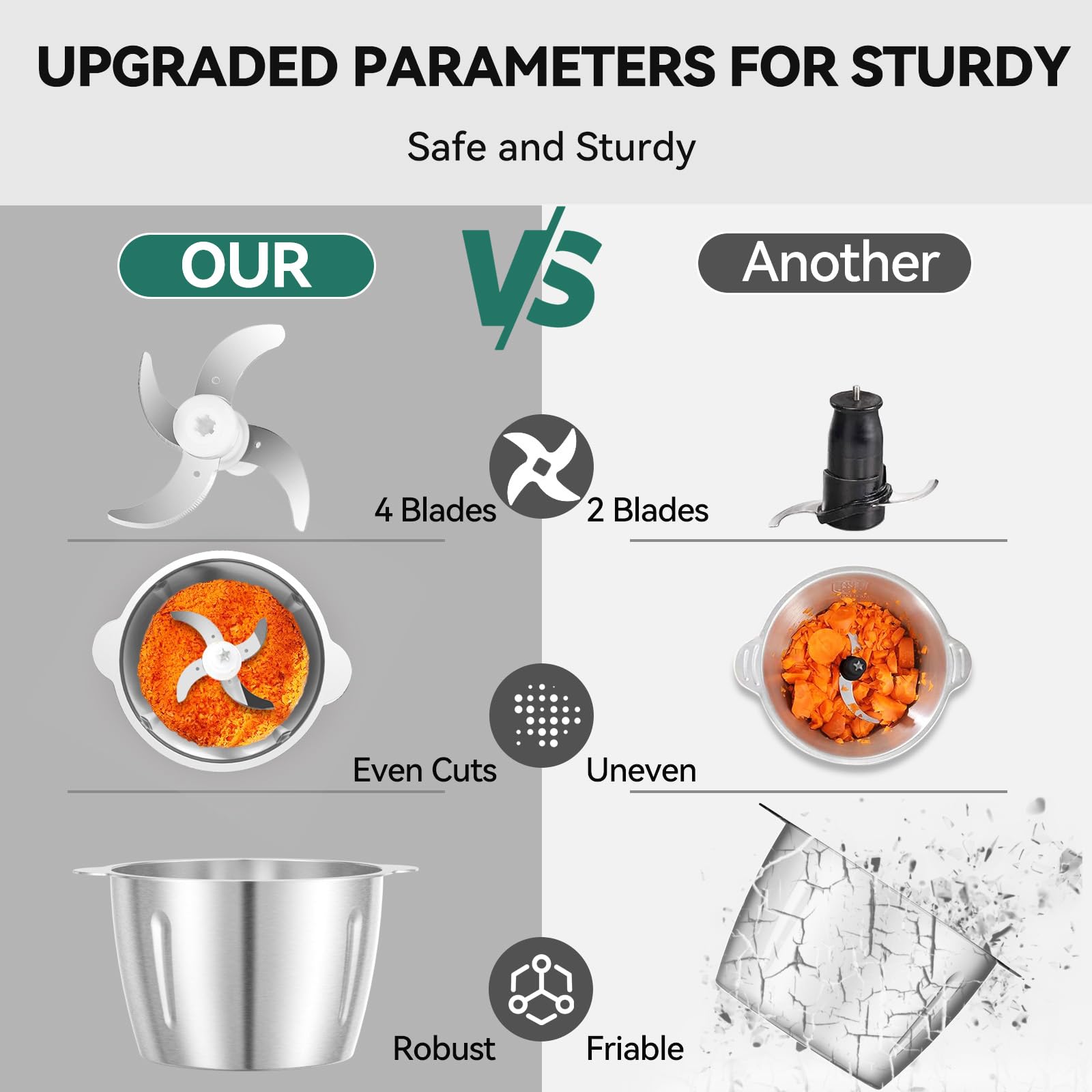 - Safe and Efficient: Our food processor equipped overheating protect, it will automatically stop working at high temperature, the blade will not spin when the machine is not lock correctly. 4D sharp blades design allows the blades to evenly chop food in 5-20s, more safety and fast