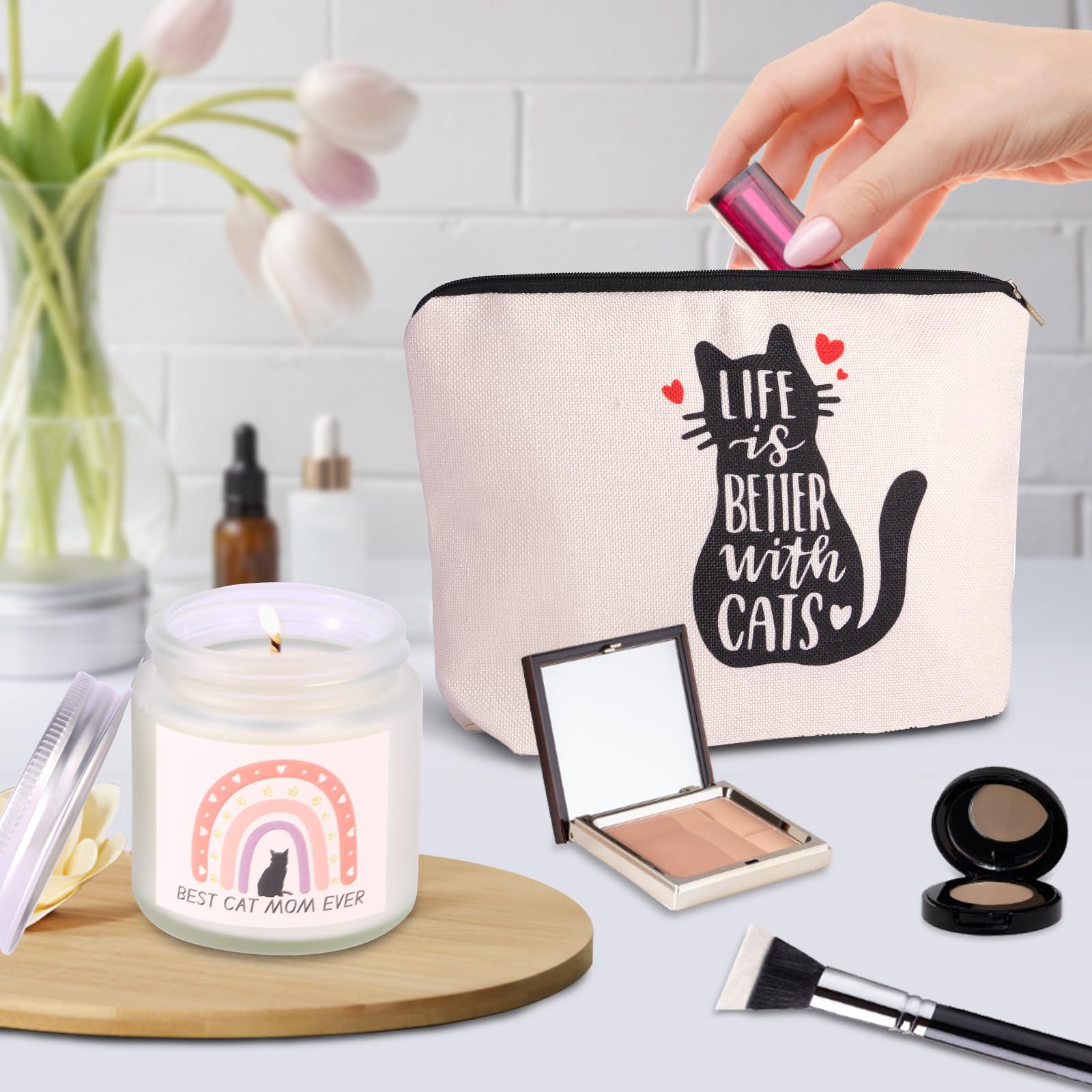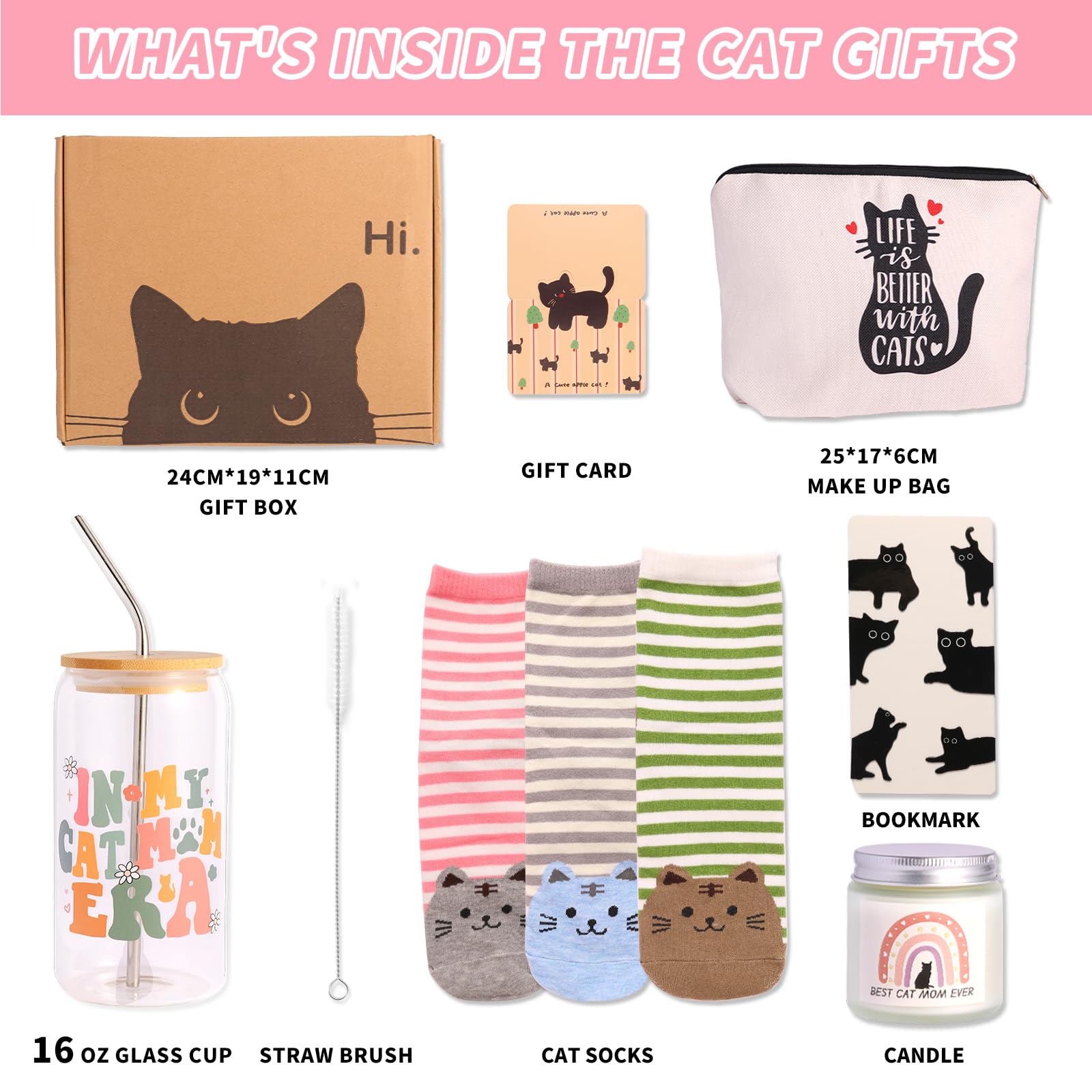 - Complete Cat-Themed Gift Set - This delightful gift set includes a 16oz coffee glass with straw and brush, a 100g lavender soy candle, a canvas makeup bag, 3 pairs of cat socks, 6 magnetic black cat bookmarks, a greeting card, and a cute gift box. Each item features charming cat designs, perfect for cat lover gifts for women