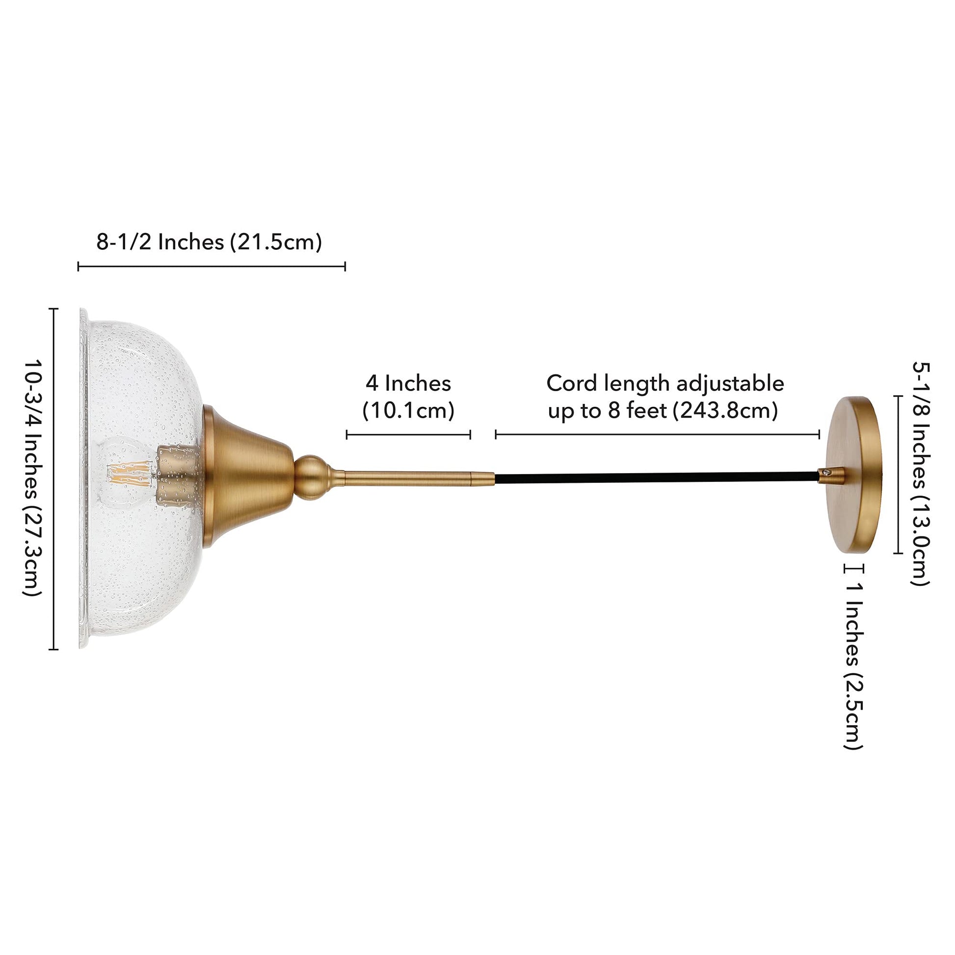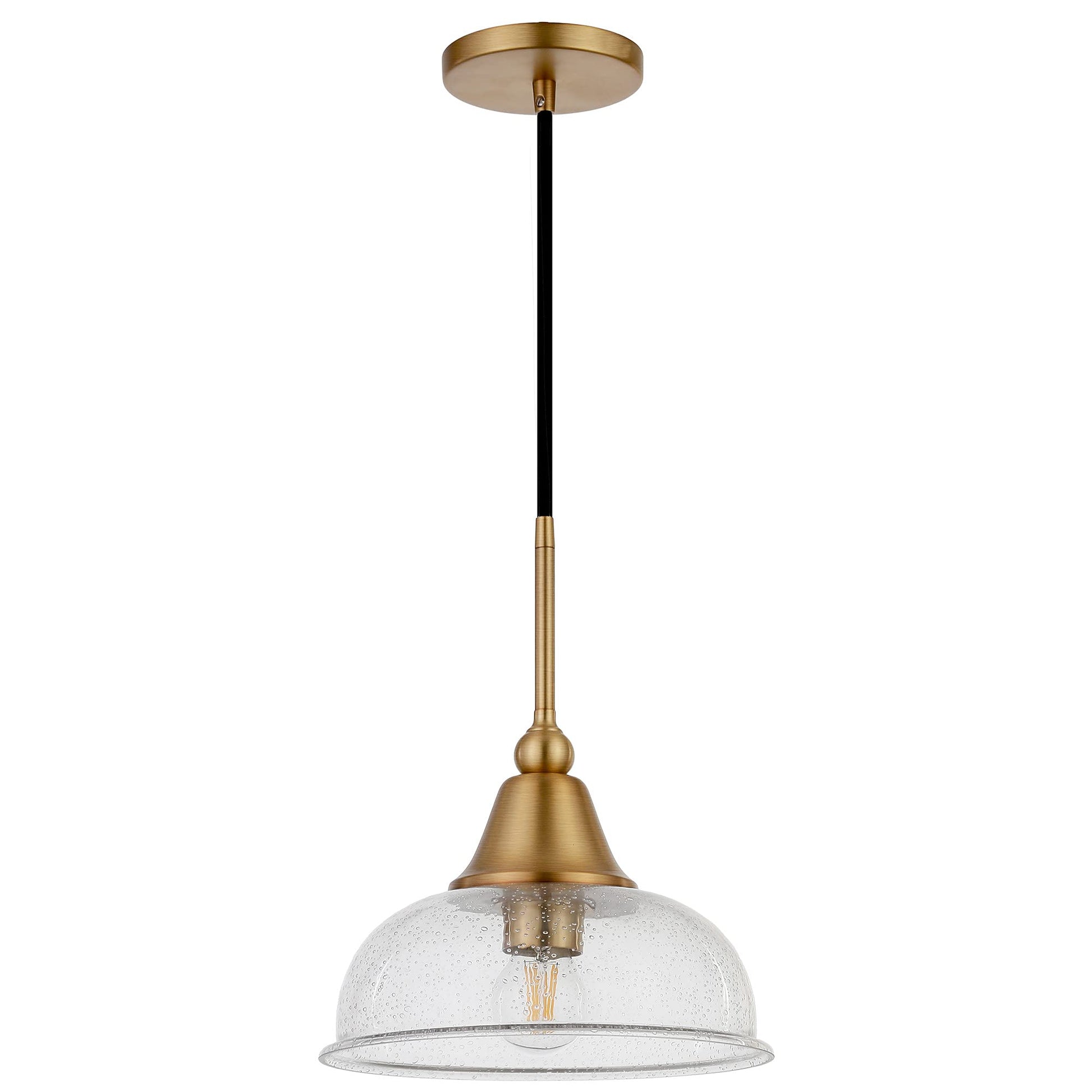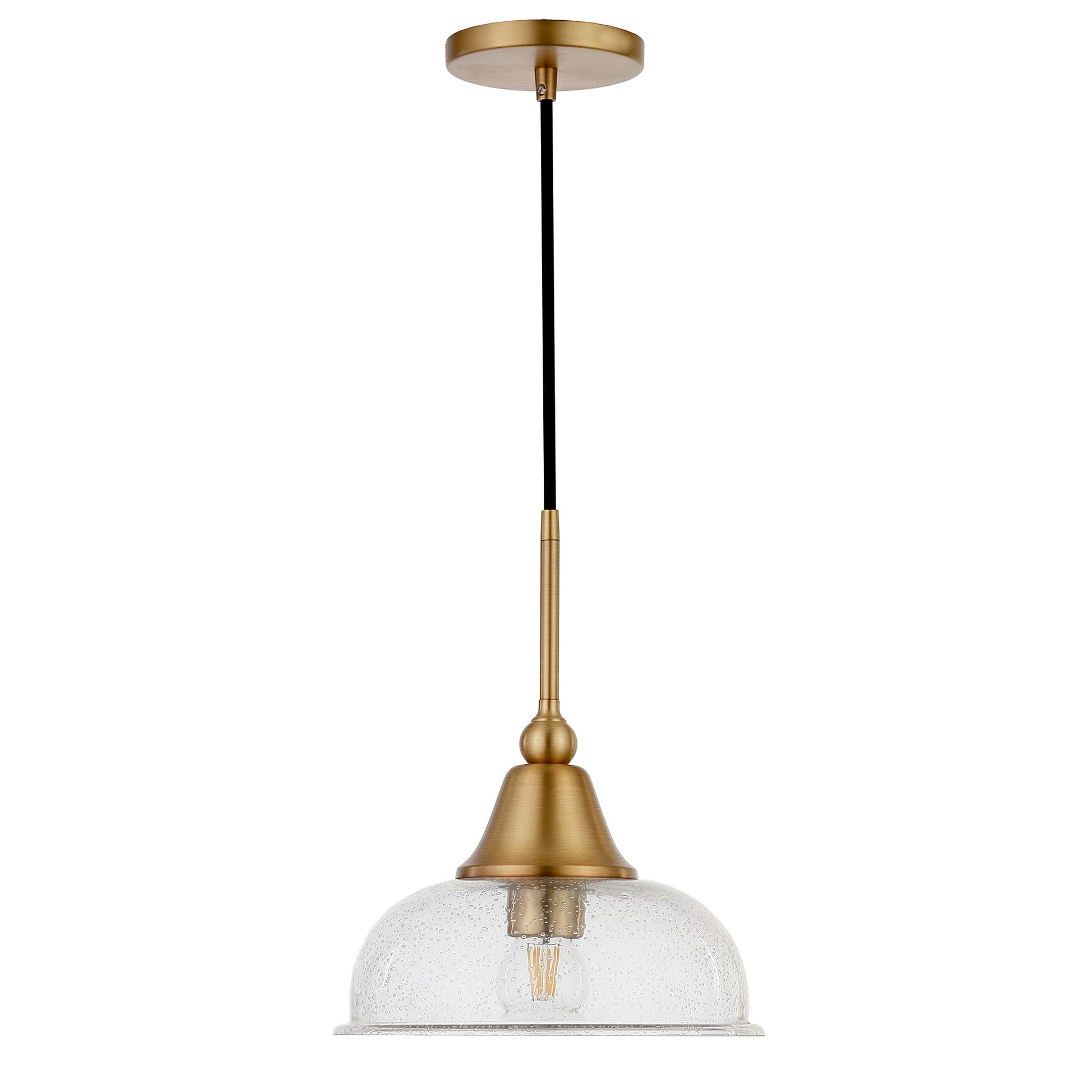 Details: A seeded glass shade brings organic interest to this traditional pendant light. The natural variation offsets the neutral metallic finish, creating an eye-catching fixture perfect for your modern farmhouse kitchen, traditional dining room, or foyer. Its height-adjustable cord allow it to fit seamlessly in any space, and your choice of bulb will let your style shine through.