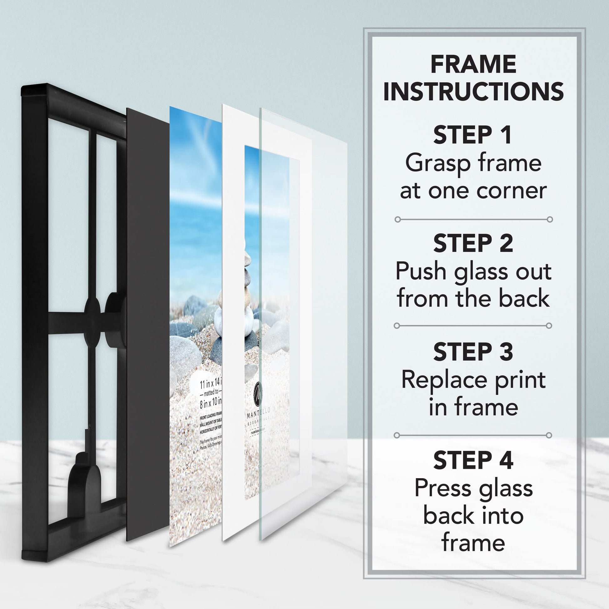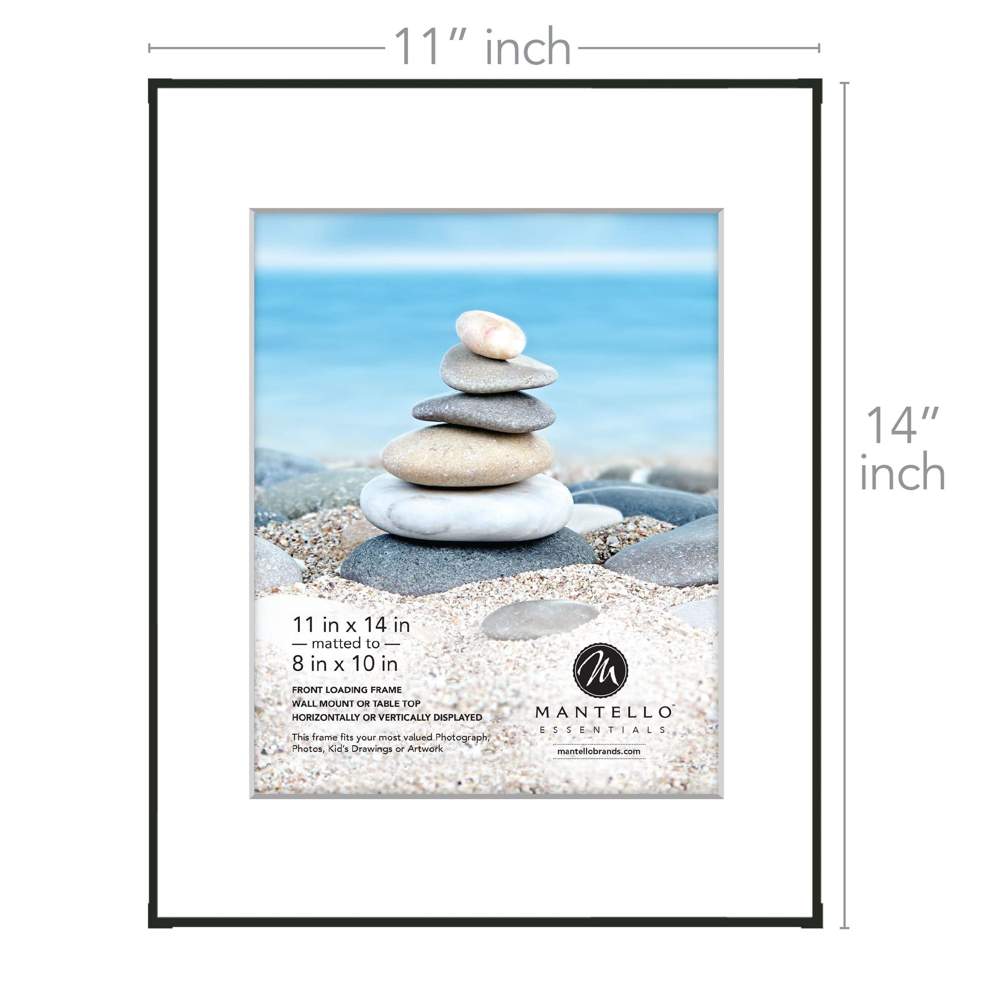 - Our black picture frames 11x14 feature a front-loading glass design so you can swap out images with ease. Each frame is made for 8"x10” photos with mat or 11”x14” without.