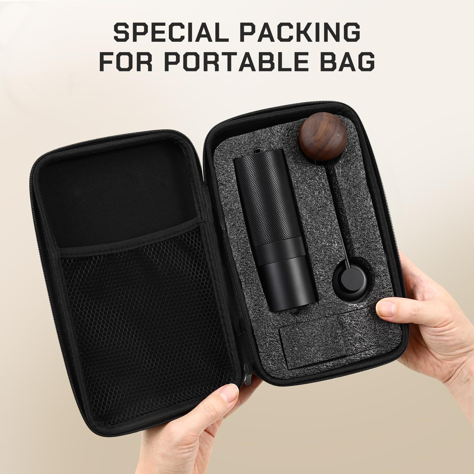 - Easy to Carry and Clean - Equipped with brush and storage pocket, easy to clean and store. Just simply clean the coffee grinder after use. DO NOT washable with water. The pocket stores the coffee bean grinder and can be taken anywhere. Suitable for camping, travel, outdoor activity, coffee festival.