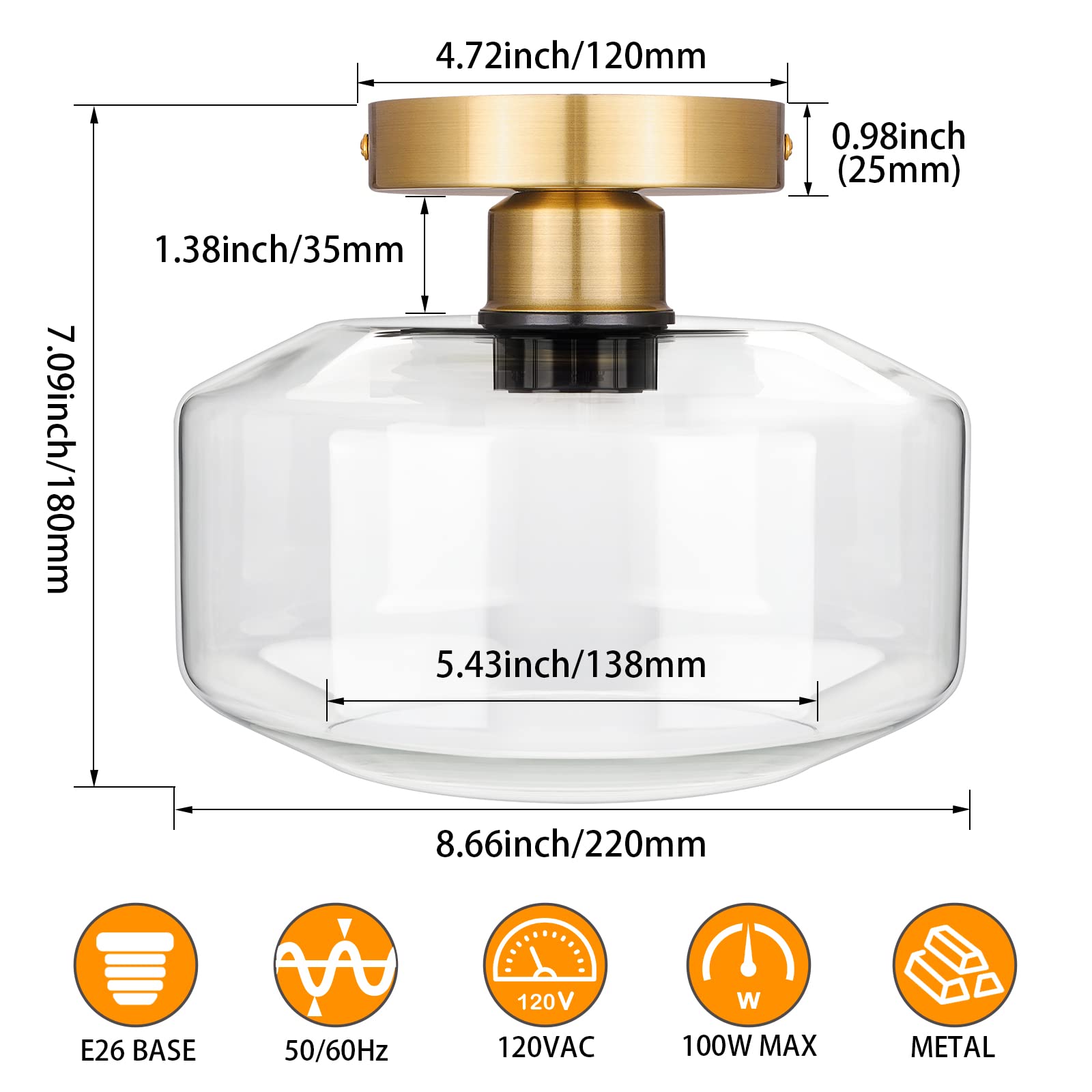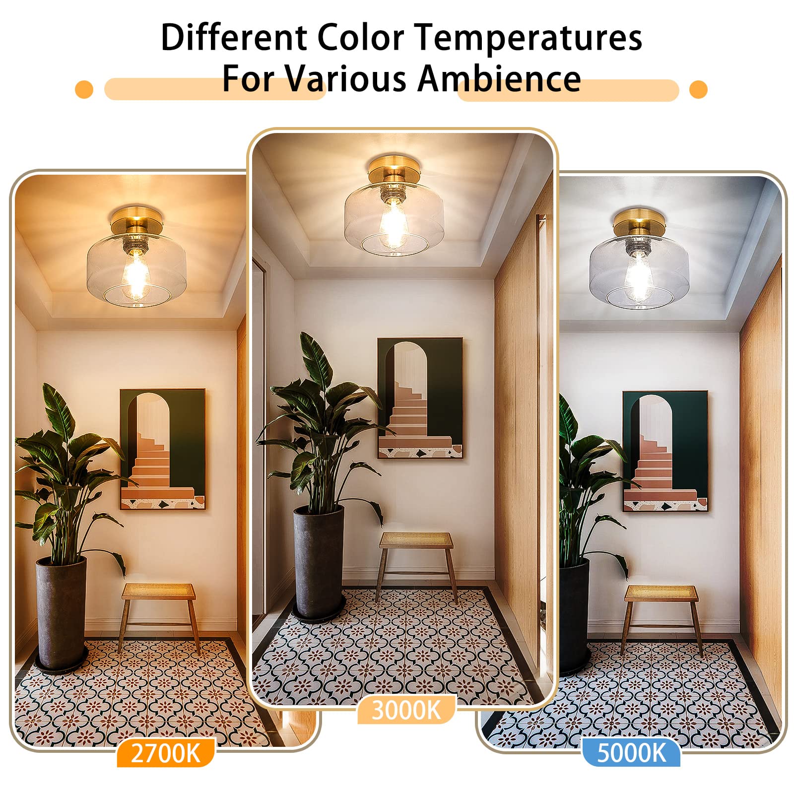 - Flush-mount Design & Vintage Style: The semi-flush mount light fixture features a unique clear glass shade and vintage style gold brushed metal base. The interior hallway light fixtures with glass shade diffuse a cozy glow for an inviting feel and offer a modern & vintage style while complementing your home decor.