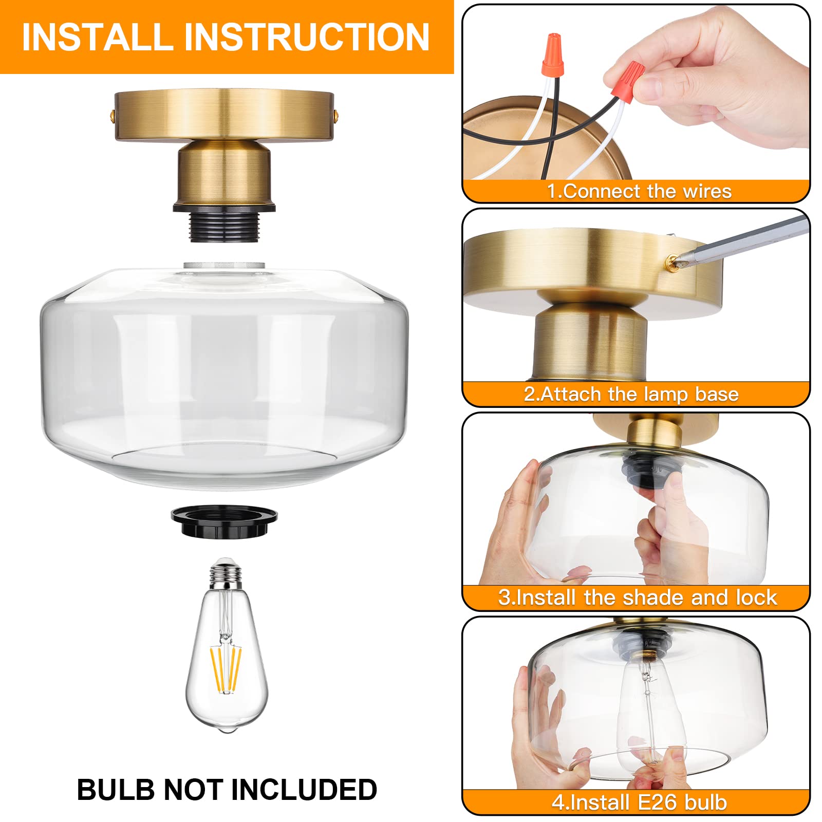 - E26 Standard Medium Base: The farmhouse semi flush mount ceiling light with standard USA socket is compatible with E26 medium base bulb(Bulb NOT INCLUDED), such as incandescent, LED, CFL and halogen bulbs (bulb maximum wattage is 60W). Choose the bulb you like to decorate your dream home.