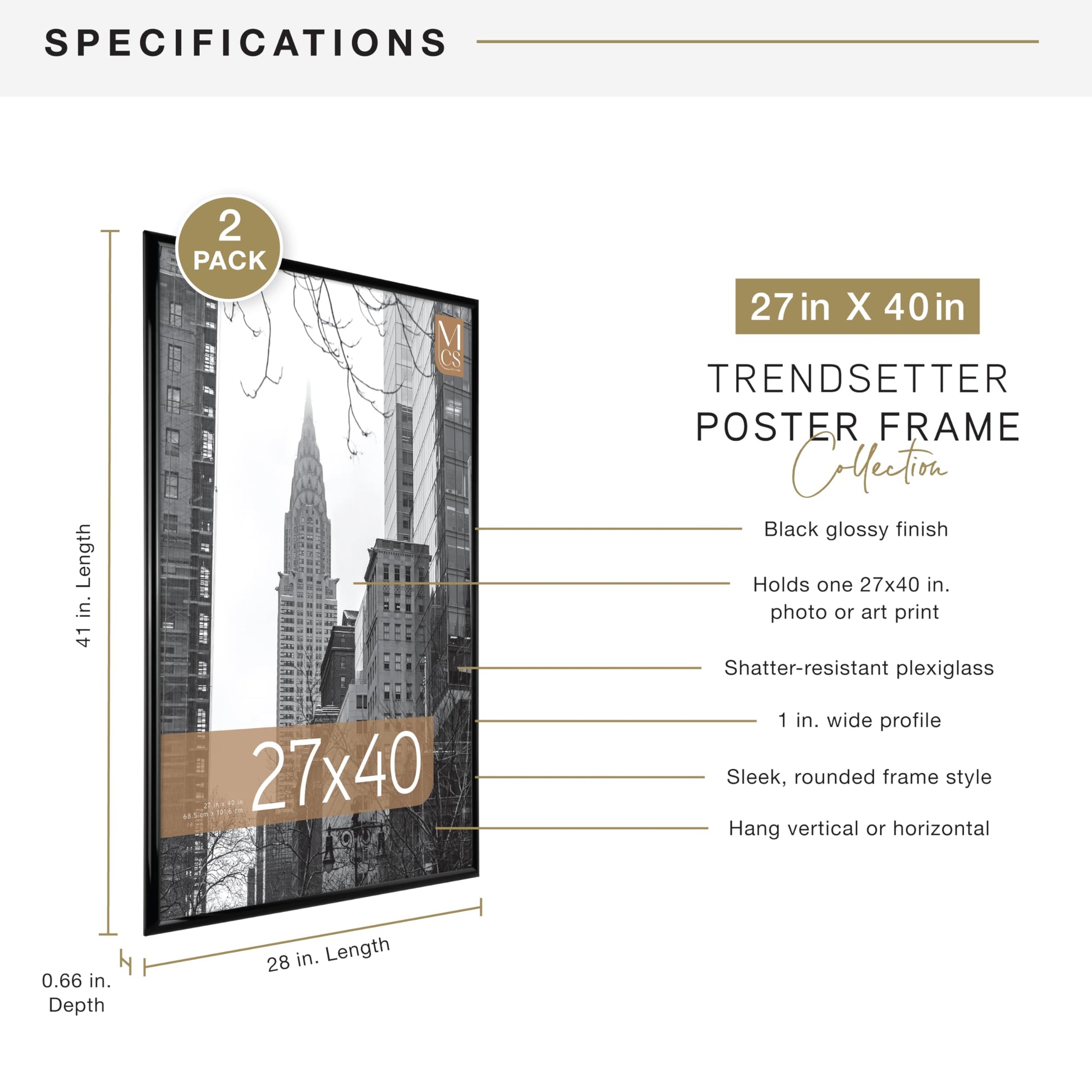 Details: 2 pk : The 27x40 Inch 2-Pack of Trendsetter Poster Frames are a great choice for displaying your favorite posters, prints or artwork. The Trendsetter was designed with a 1 inch extruded plastic frame and durable clear styrene front. The classic high gloss black finish coordinates with most décor styles, making it the perfect addition to your living room, bedroom, office or entry way. The Trendsetter is easy to hang and includes pre-attached sawtooth hangers for vertical or horizontal wall hanging. MCS Trendsetter Poster frames are available in many sizes. Use this set of two frames to create a gallery look and add a focal point to any room.
