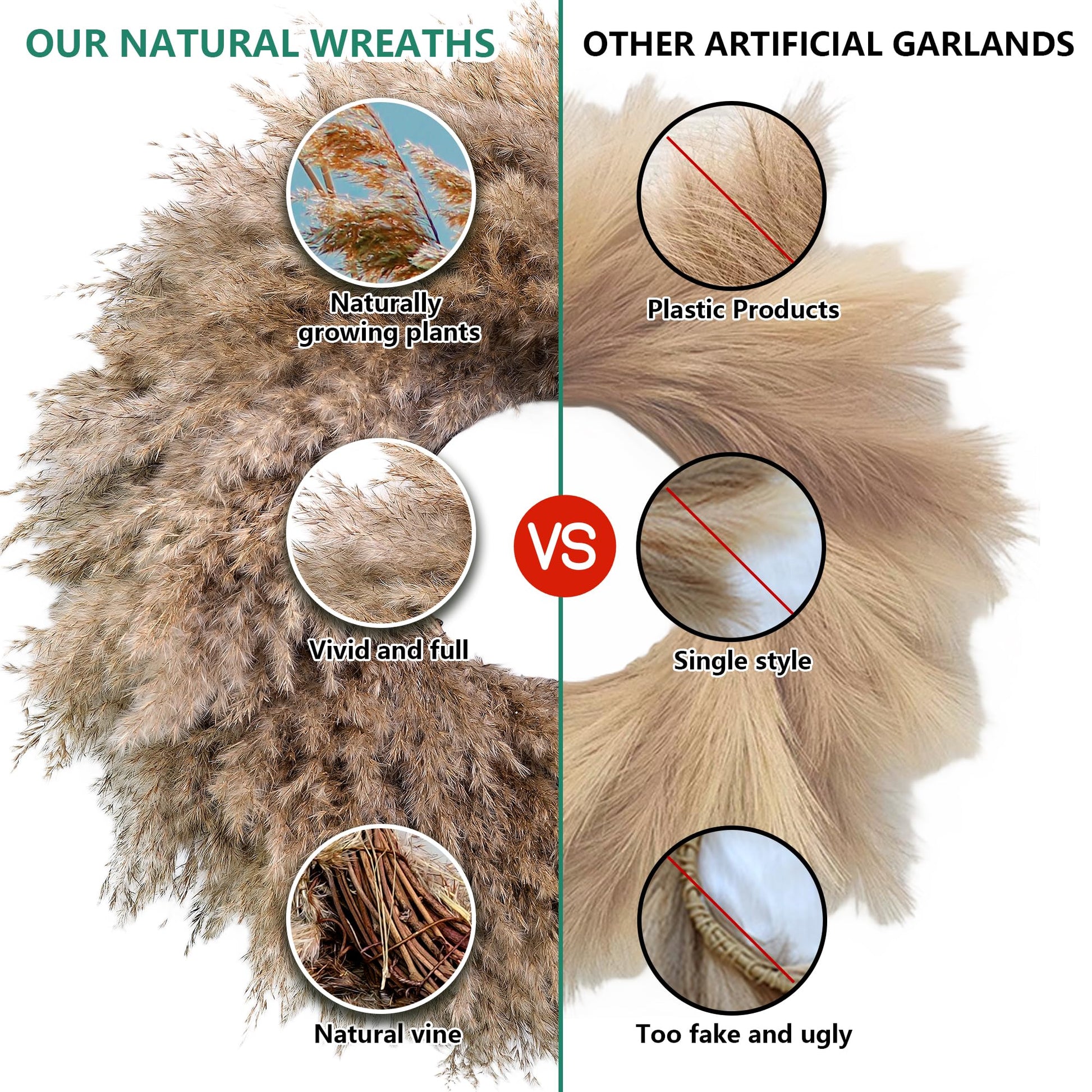 - Sustainable Boho Elegance: Embrace lasting beauty with our natural pampas grass wreath. Unlike faux options or wheat wreath, our dried flower wreath is made from sustainably harvested real pampas grass, twigs, grape vines, carefully preserved to maintain its soft texture and elegant appearance. Enjoy the charm of bohemian decor without compromising on authenticity.