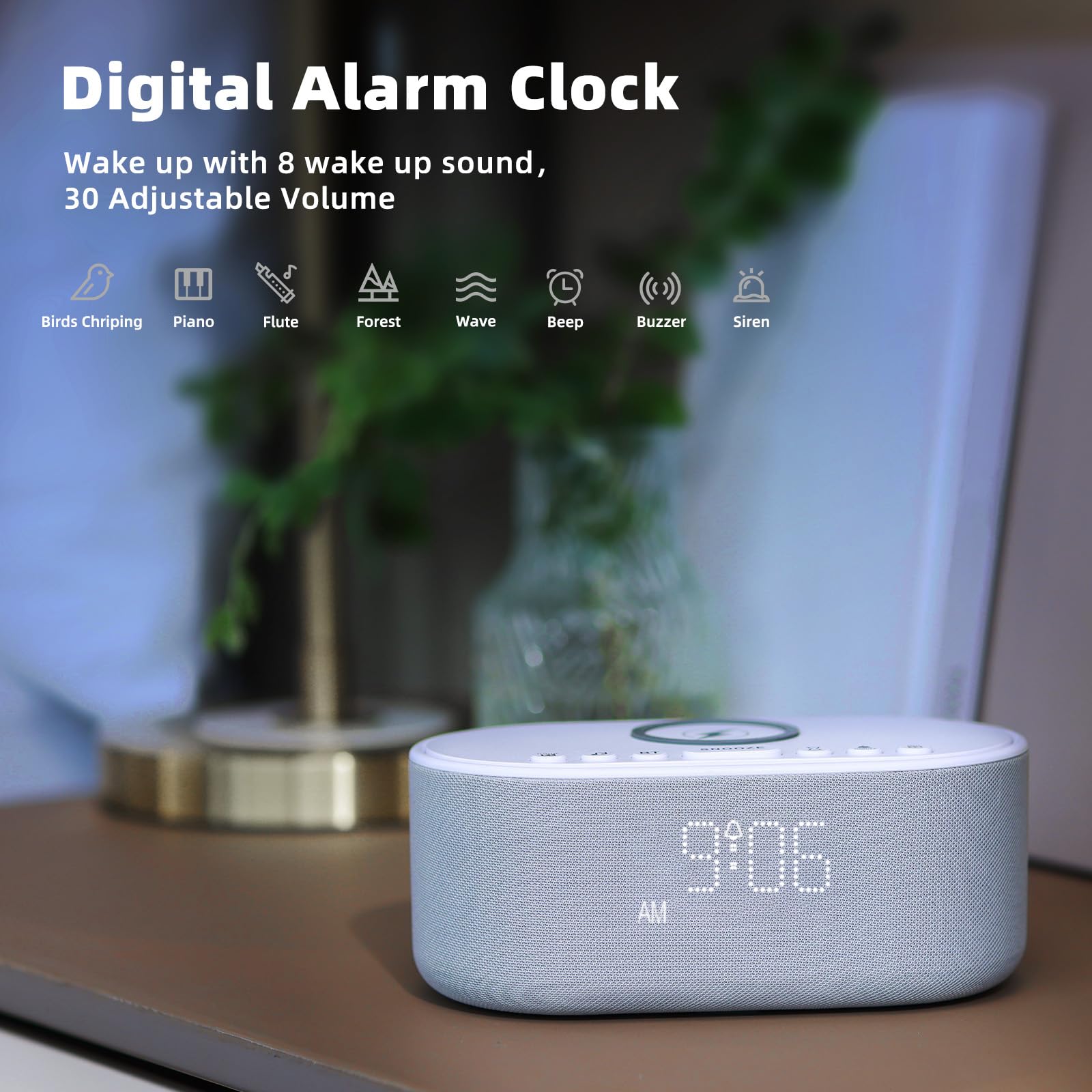 - Multi-Functional Design: Experience the ultimate in convenience with our all-in-one white noise alarm clock. Built-in Bluetooth speaker and 10W fast wireless charger, Sleep timer,Dimmable,Snooze,12/24-hour format, DST, designed to streamline your morning routine and evening relaxation.