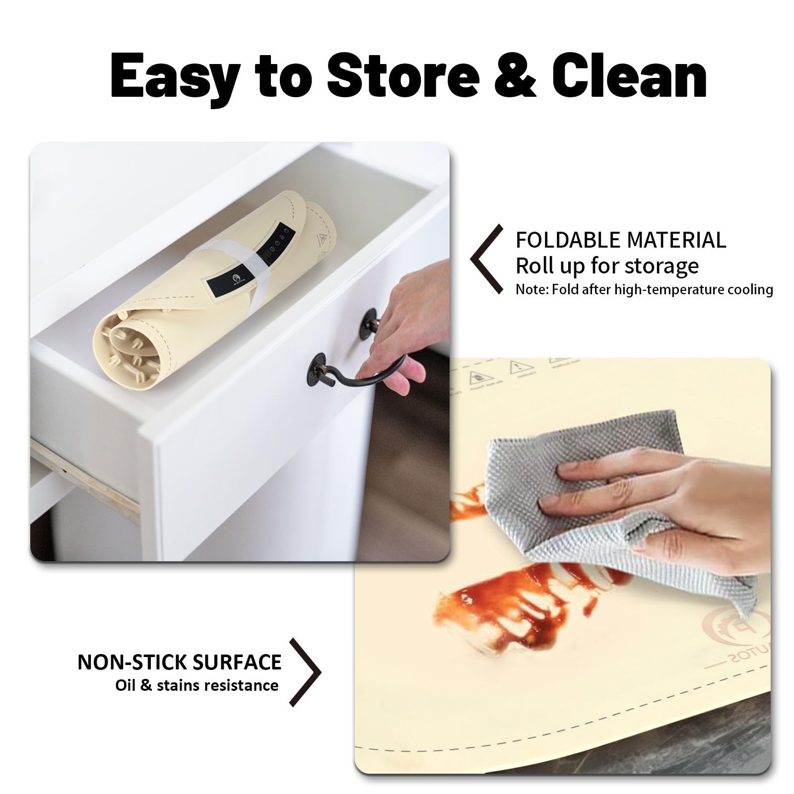 - Easy to Clean & Space-Saving Design: Crafted from premium, non-stick silicone, this mat resists stains and oils. Simply wipe clean with a damp cloth. Its foldable and lightweight design makes storage a breeze, perfect for any kitchen