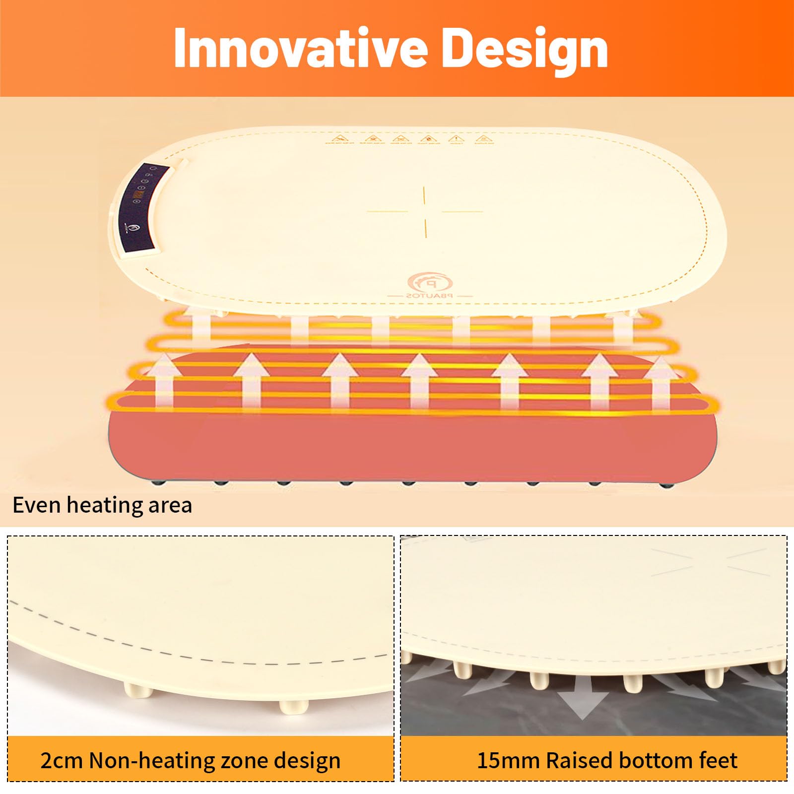 - Innovative Heat Distribution & Versatile Use: Raised bottom feet promote even heat distribution and protect surfaces from overheating. The non-heating edges prevent accidental burns, making it safe for use on any table or countertop