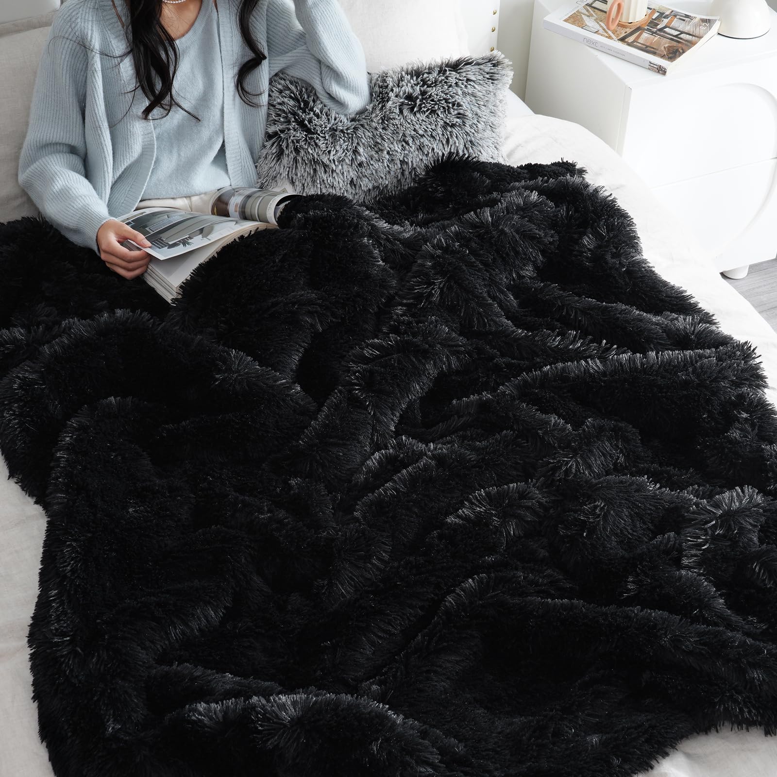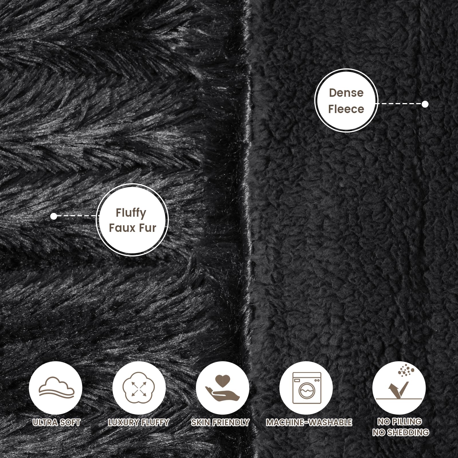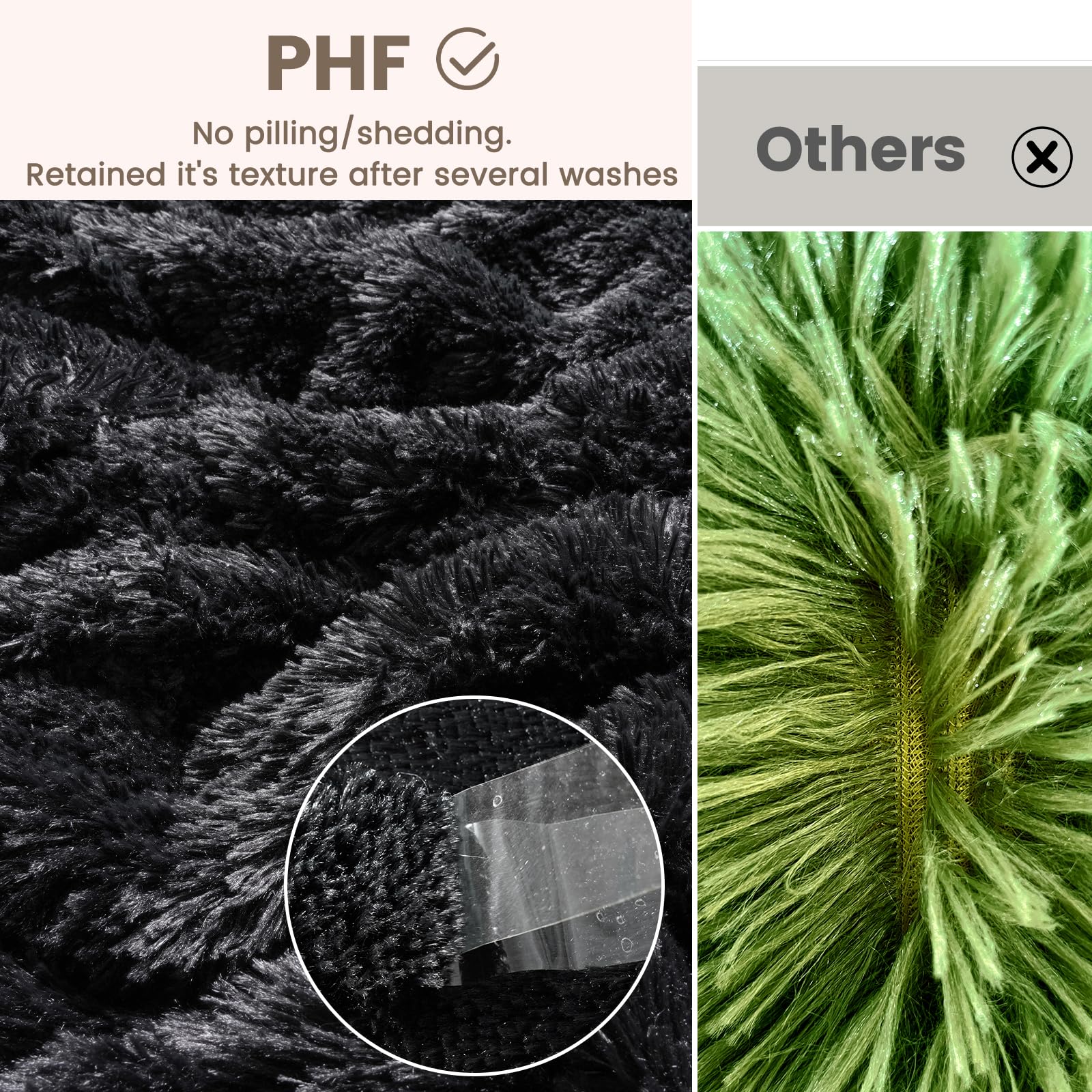 PHF Luxury Fuzzy Faux Fur King Comfy Plush Thick Fluffy Blanket, Warm Soft Shaggy, Elegant Furry Throw for Home Decor, Bed, Couch, Chair, Sofa, Black, 108" x 90"