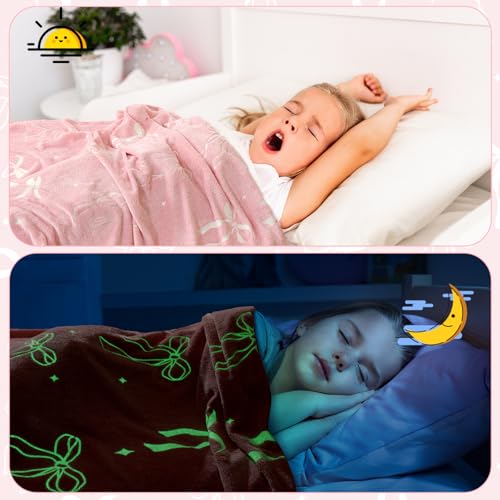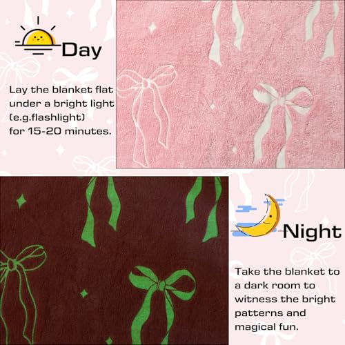 Pink Bow Blanket for Girls 50 x 60 Inch Glow in The Dark Throw Blanket Cute Bow Theme Flannel Plush Preppy Coquette Gifts Dorm Essentials for Christmas Thanksgiving Gift Decoration