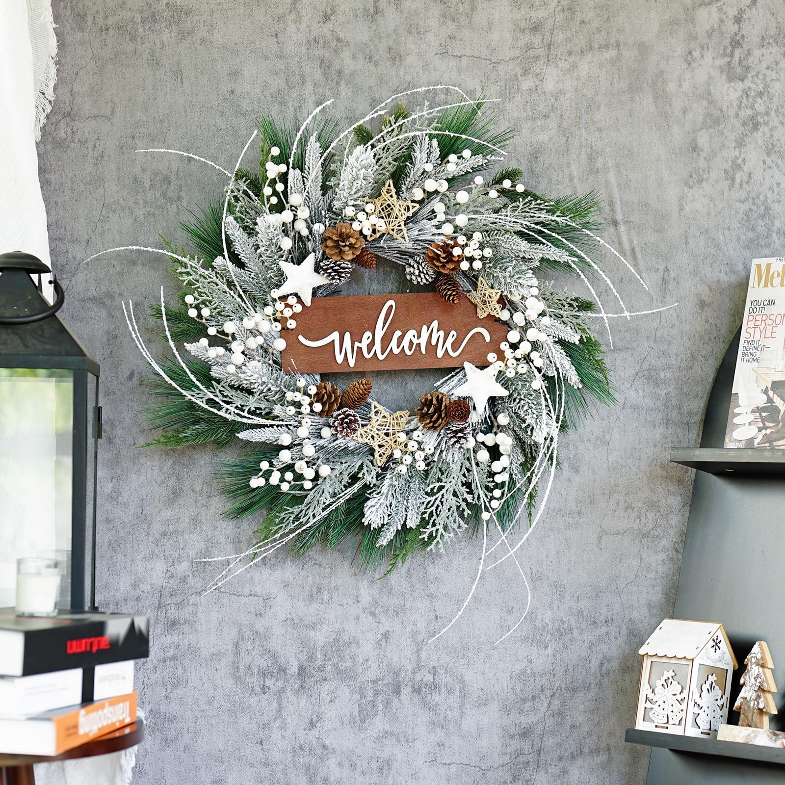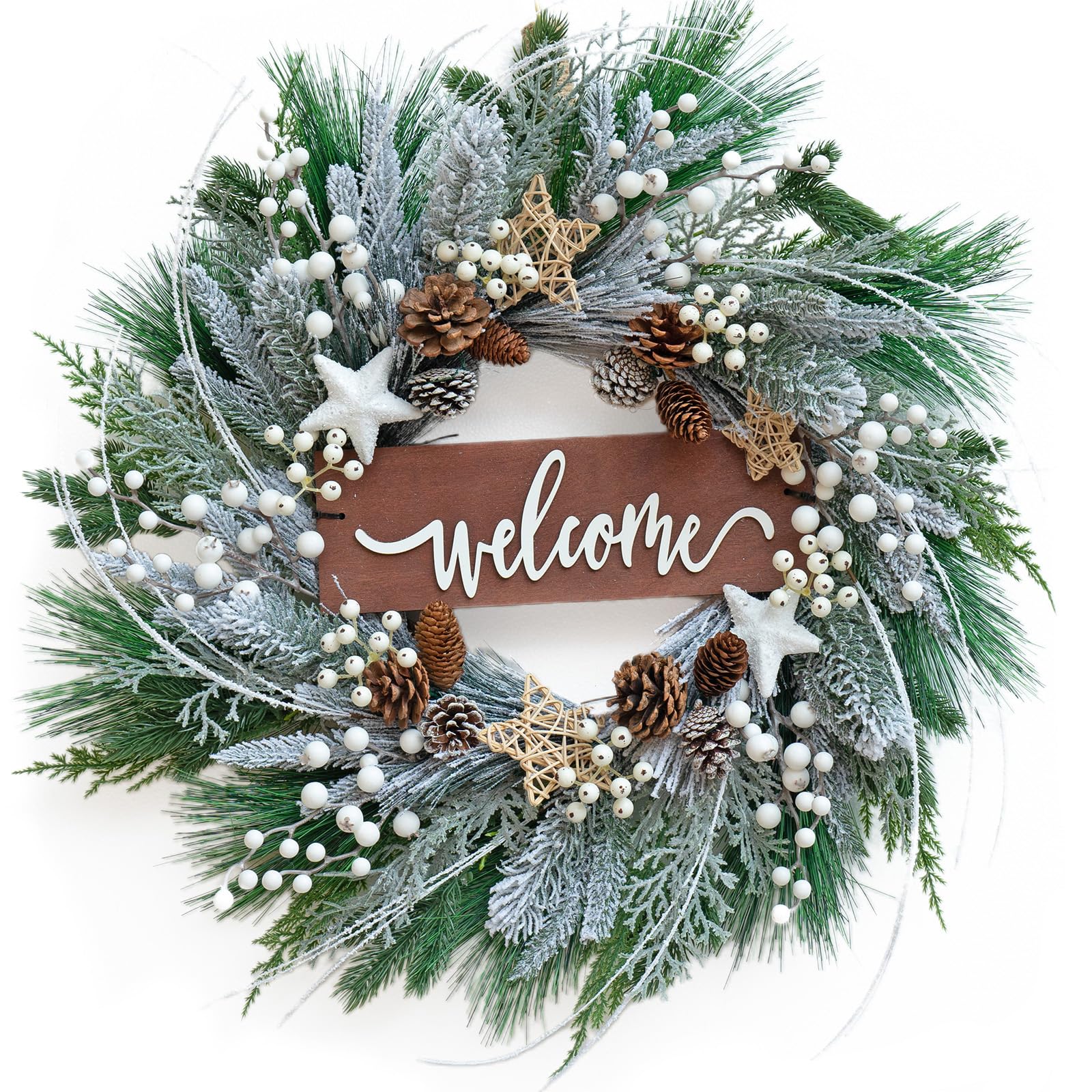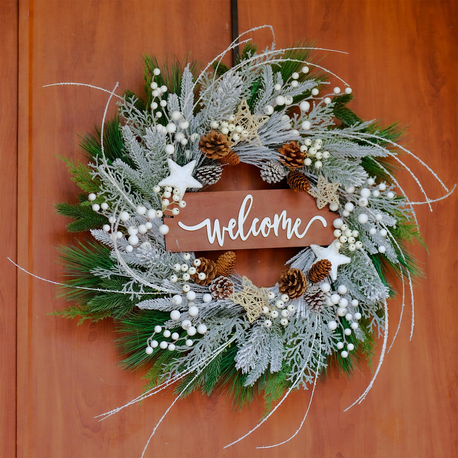- Unique Christmas Door Wreath:The Christmas wreaths for front door is based on green and white pine needles, adorned with white berries of varying sizes and brown pine cones. It features an eye-catching "Welcome" wooden logo in the center. This simple but exquisite design makes this greener wreath a bright landscape on the front door, instantly enhancing the festive atmosphere