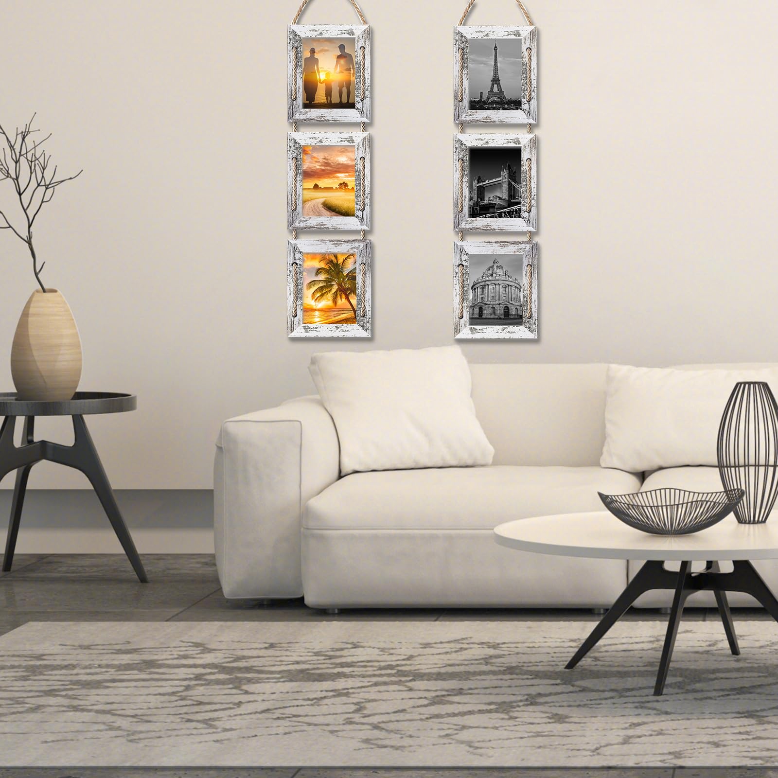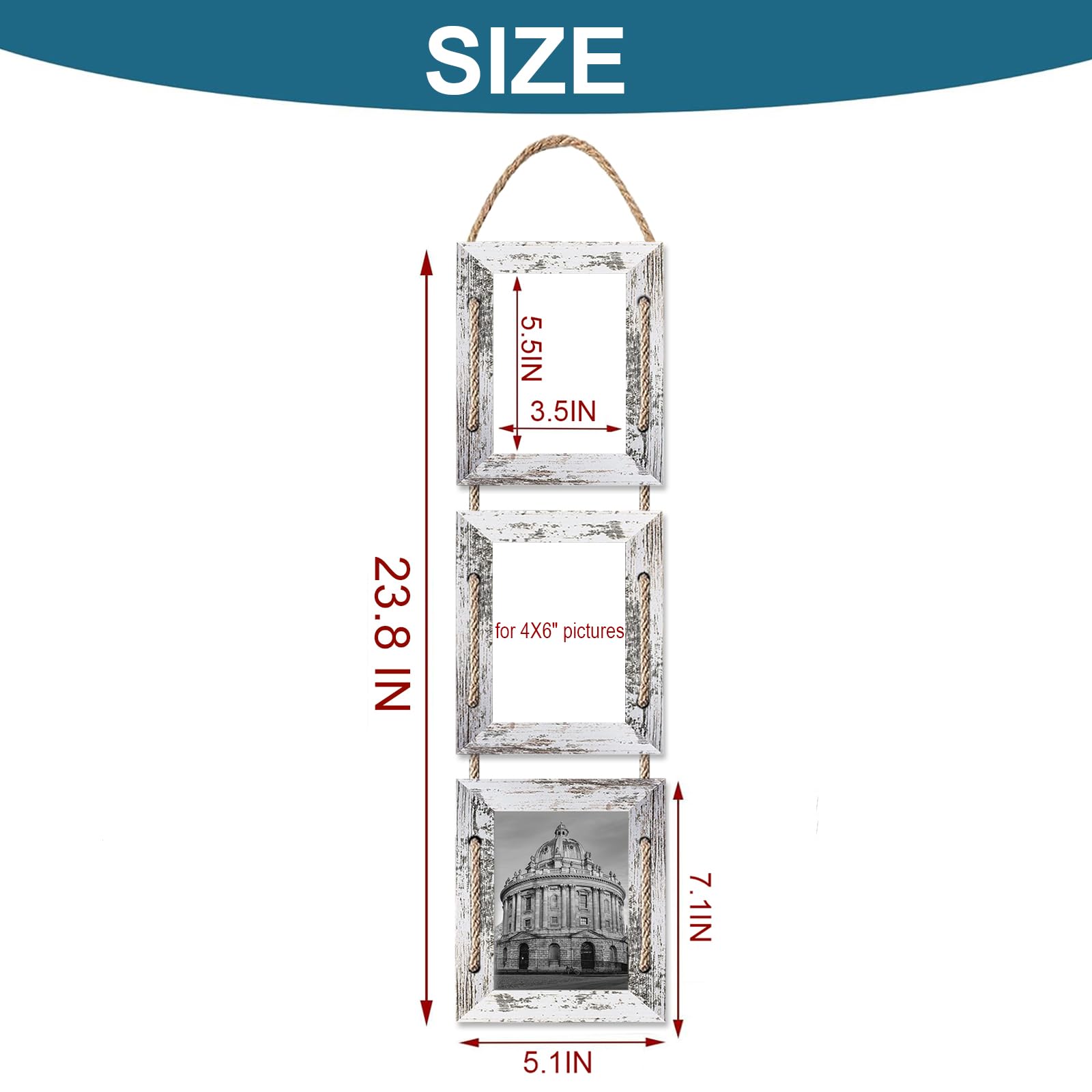 PWTAKO 4x6 Hanging Collage Picture Frames Wall Decor, 3-Opening 4x6 Rustic Wood Frame with Hemp Rope, 2 Pack,White