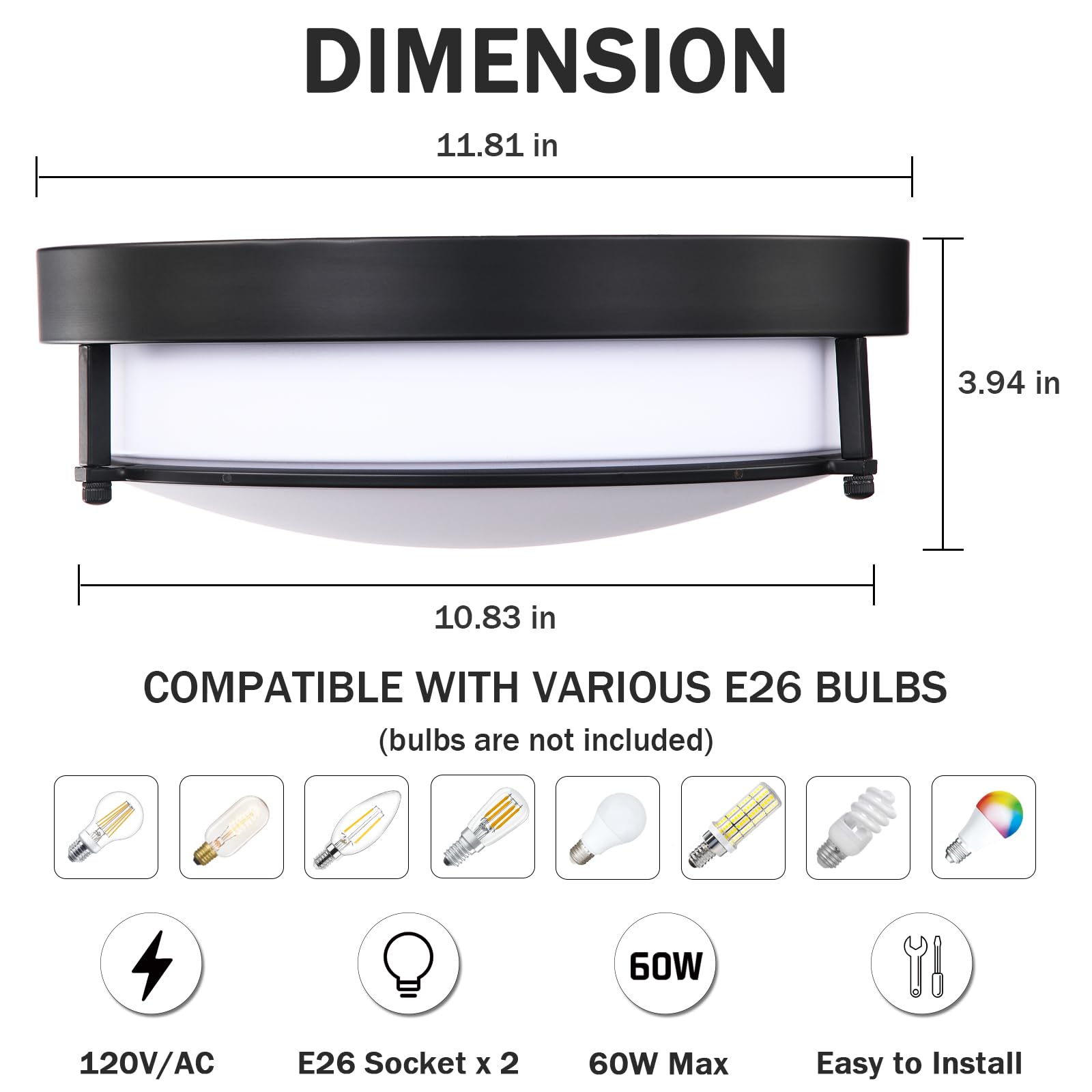- E26 Socket x 2: This black ceiling light fixture feature 2 E26 sockets, allowing you to choose from various E26 bulb types (Max 60W). It is also compatible with dimmable bulbs and dimmer switch (bulbs and dimmer not included)