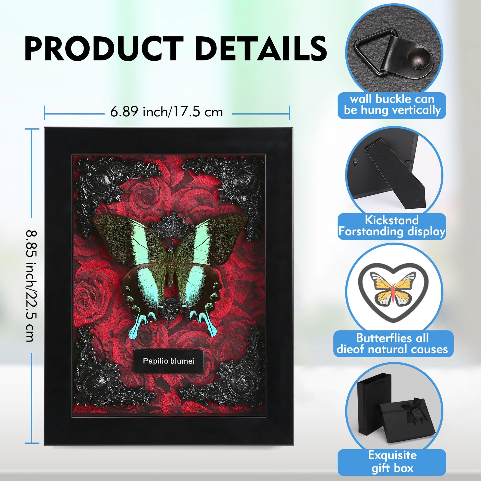 - 【UNIQUE HANDMADE BUTTERFLY FRAMED】Our 8.85x6.89x1.18 inch black real butterfly framed is made of MDF wood and anti-shatter plexiglass, Plexiglass is lighter and stronger than glass, and shatter-resistant also protect your taxidermy butterfly from dust, moisture, and scratches, Real Butterfly Specimen are clearly visible. when framed butterfly taxidermy fall to the ground you won't worry about hurting the kids.