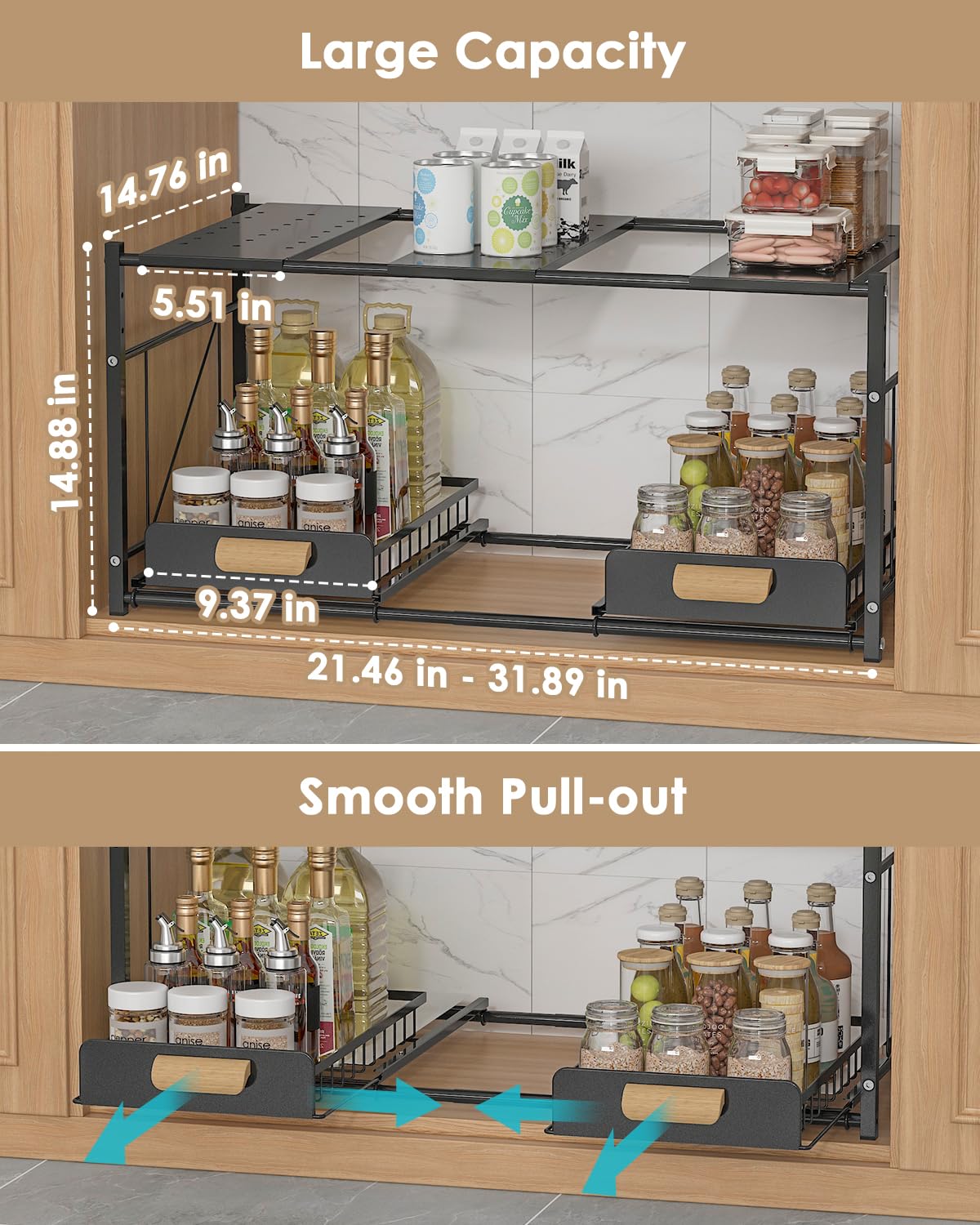 - Extendable Length: The length of the under sink organizers and storage can be easily adjusted from 21.46 inches to 31.89 inches with the extension rails.