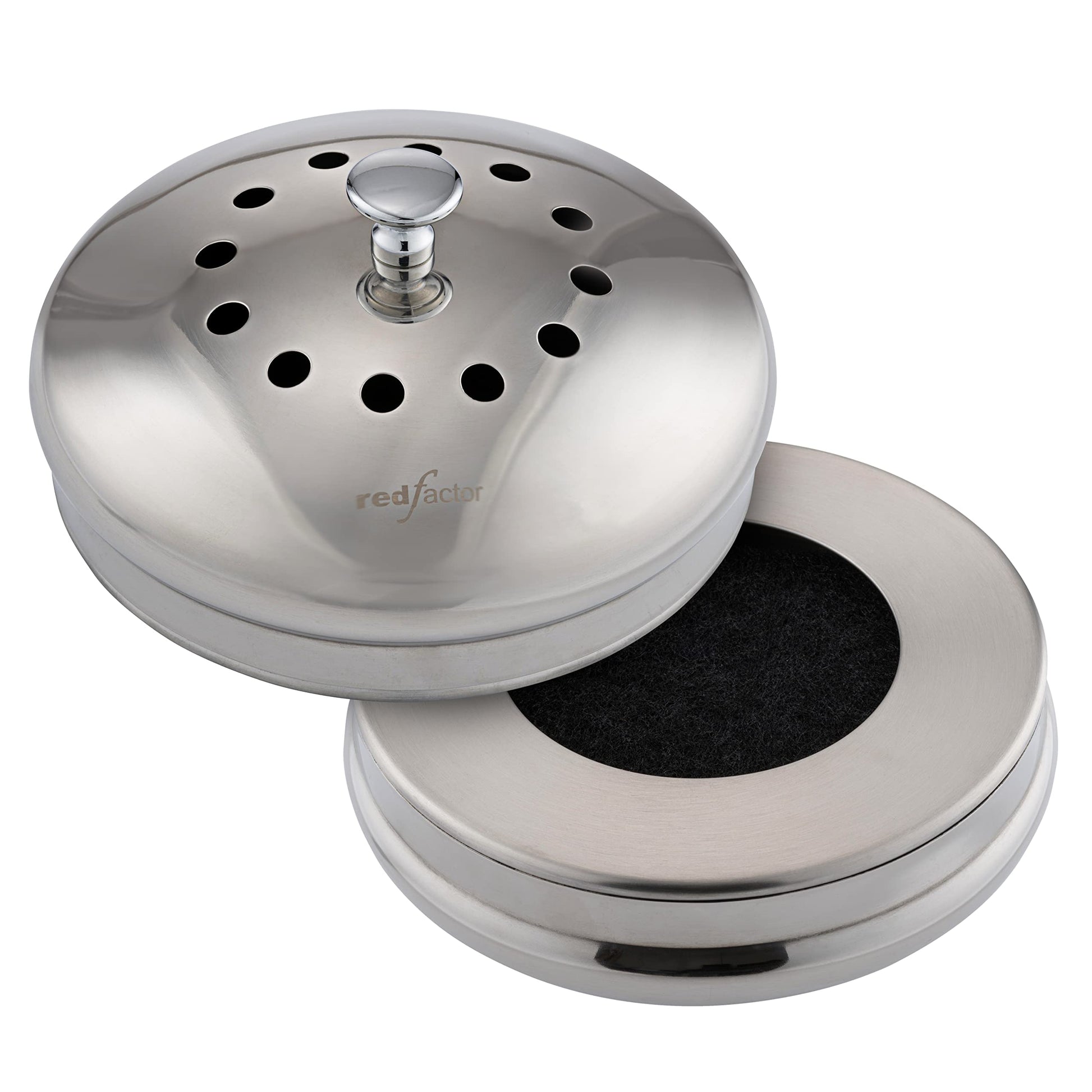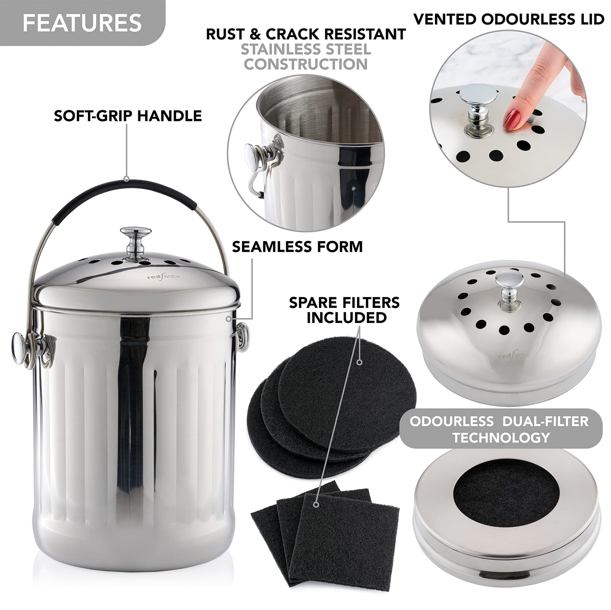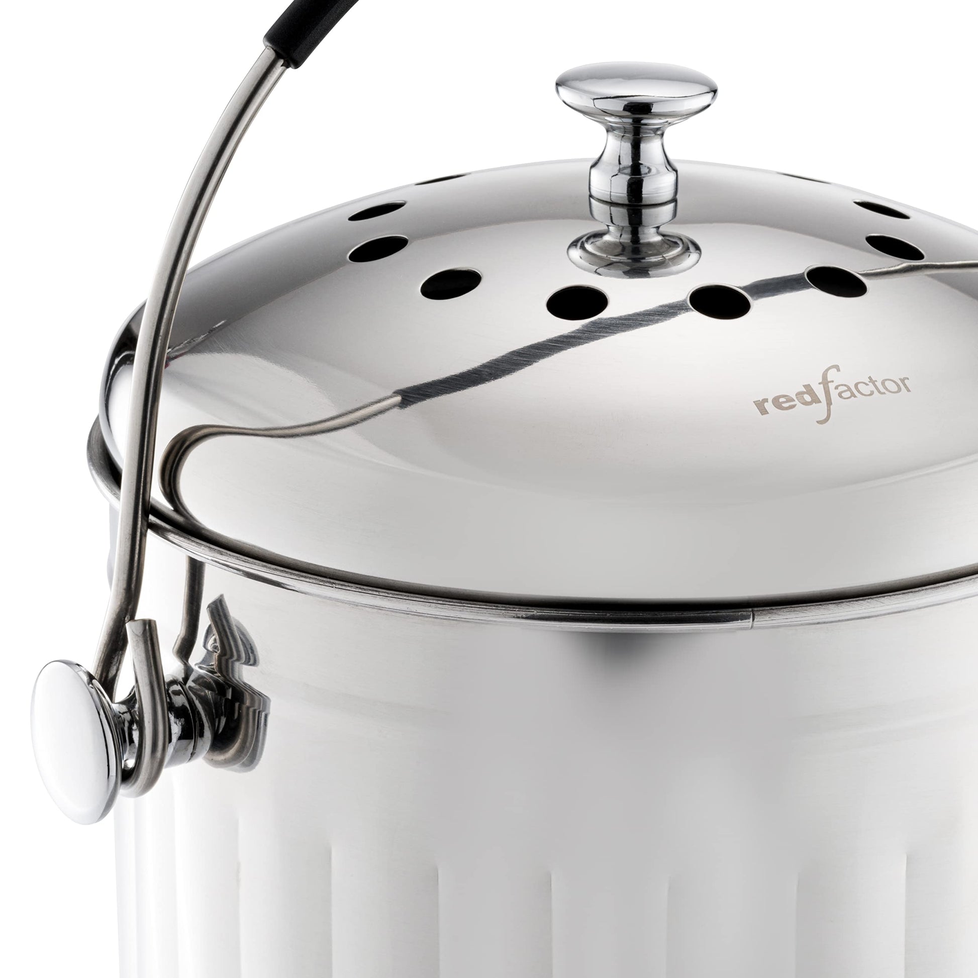 RED FACTOR Premium Compost Bin for Kitchen Countertop - Stainless Steel Food Waste Bucket with Innovative Dual Filter Technology - Includes Spare Filters (Brilliant Steel, 1.3 Gallon)