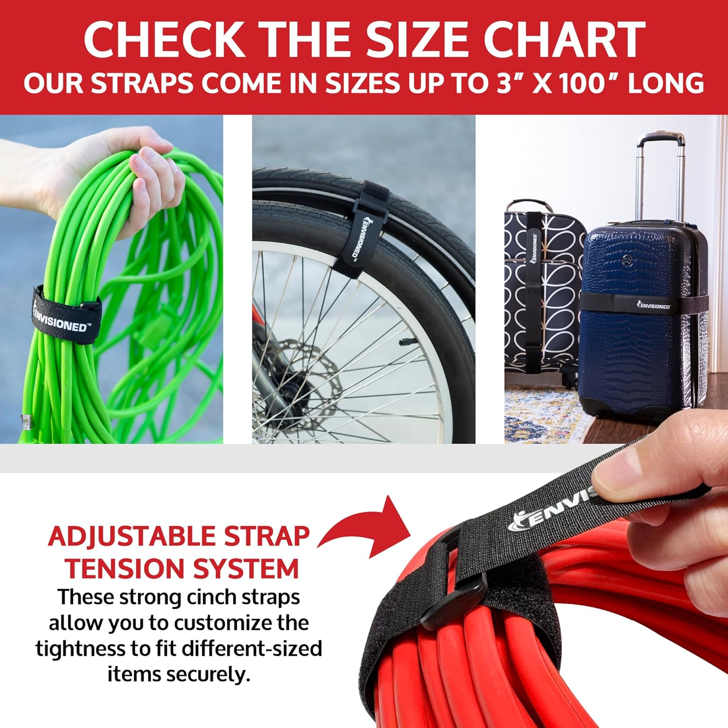- MULTI-PURPOSE – These adjustable cinch straps are perfect for organizing and securing items in your home, garage, office, vehicle, or for outdoor activities like camping. The strong gripping hook and loop design ensures a firm hold without slipping, making them ideal for bundling cables, hoses, tools, and more.