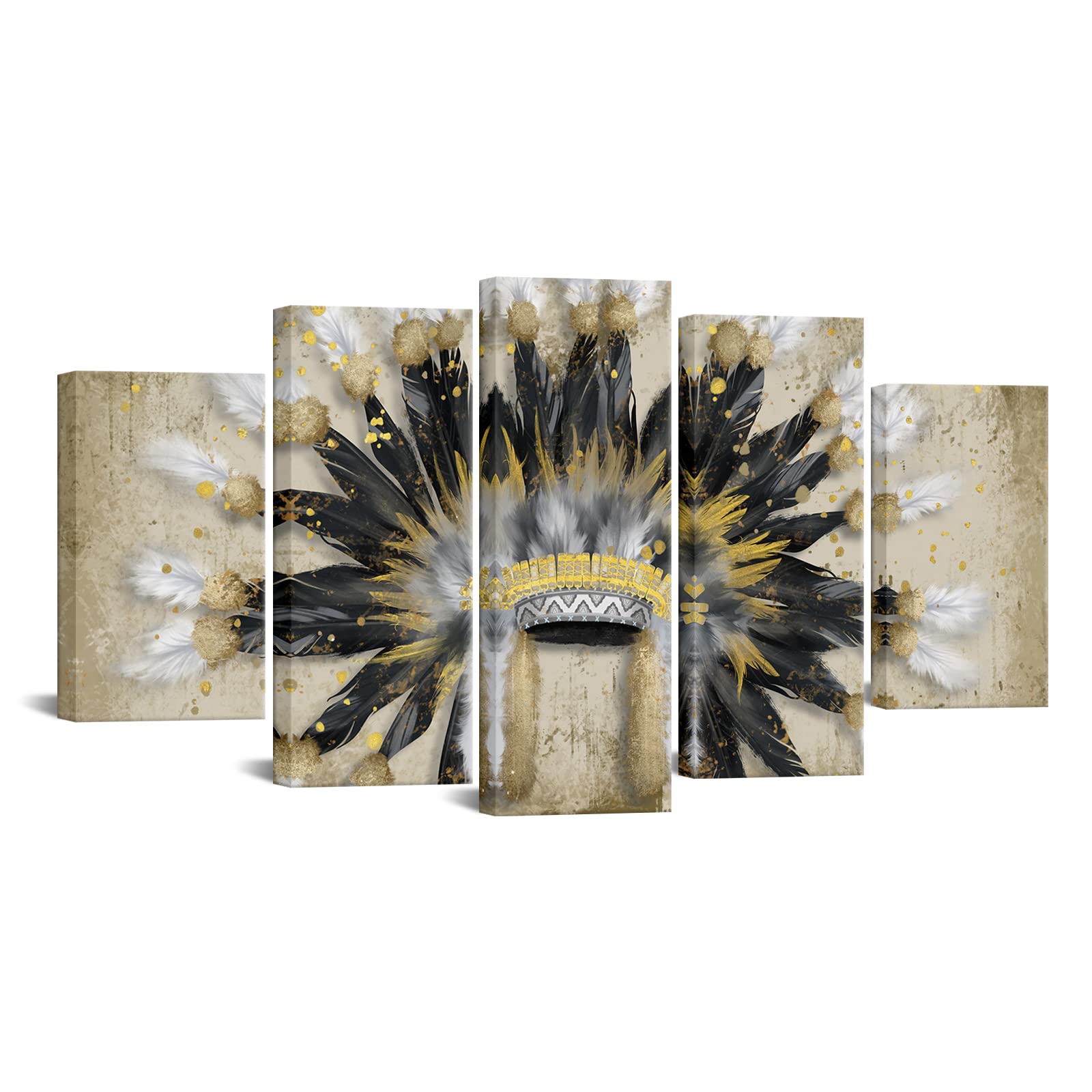 RyounoArt 5 Piece Indian Canvas Wall Art Native American Chiefs Headdress Feathered Painting Vintage Home Living Room Gallery Wrap Ready to Hang