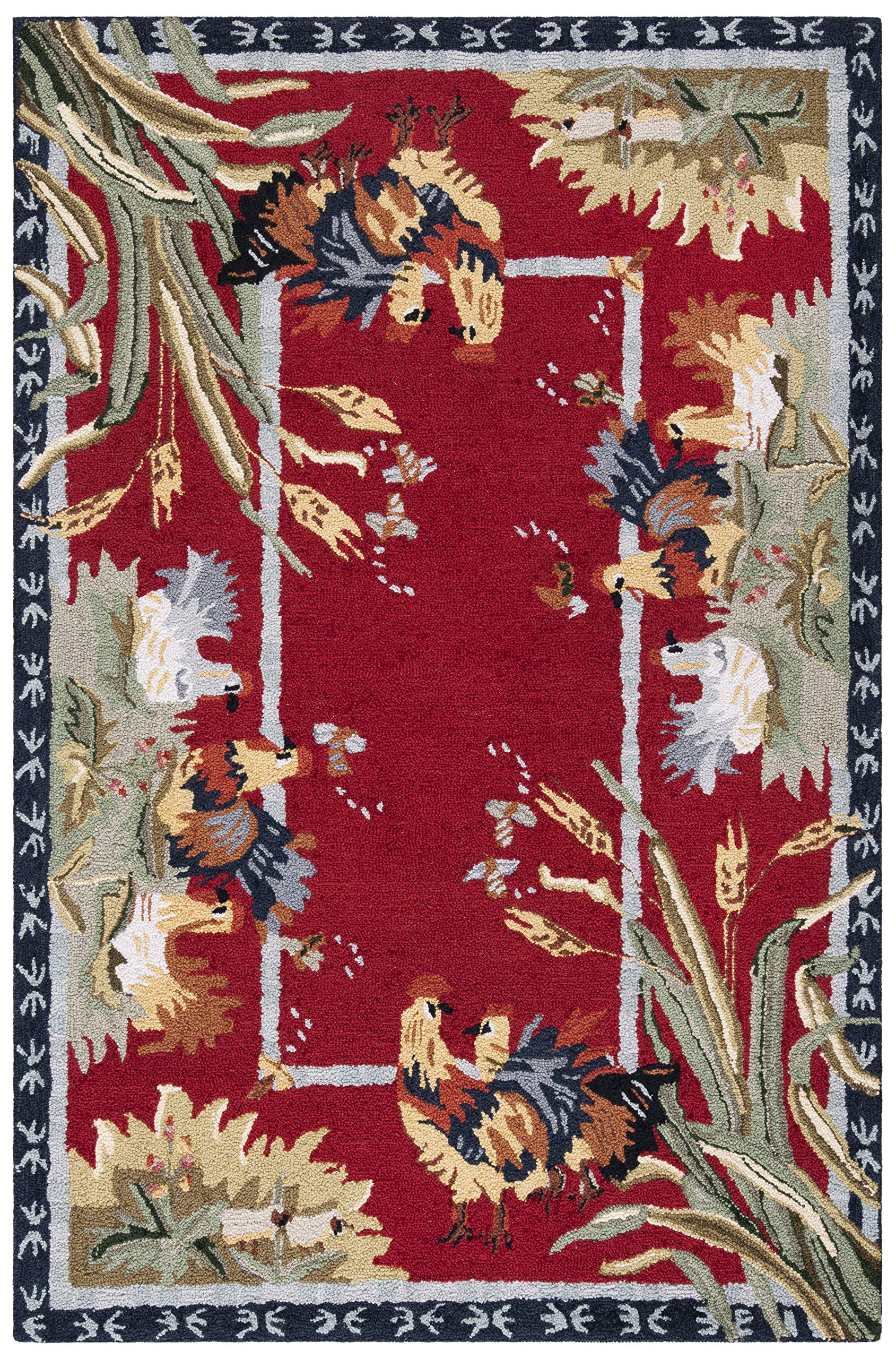 - This rug features a burgundy background, and displays a stunning roosters pattern in shades of green, red, tan, ivory, grey, olive, and rust