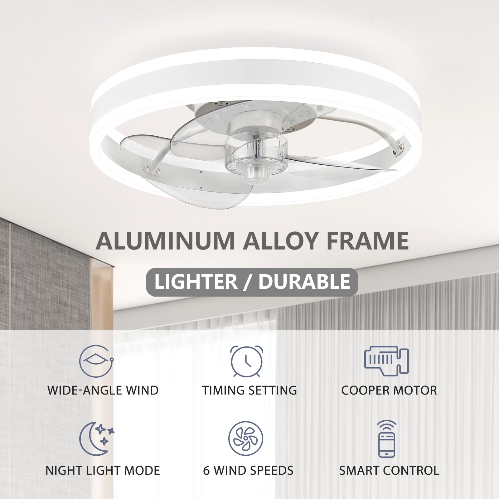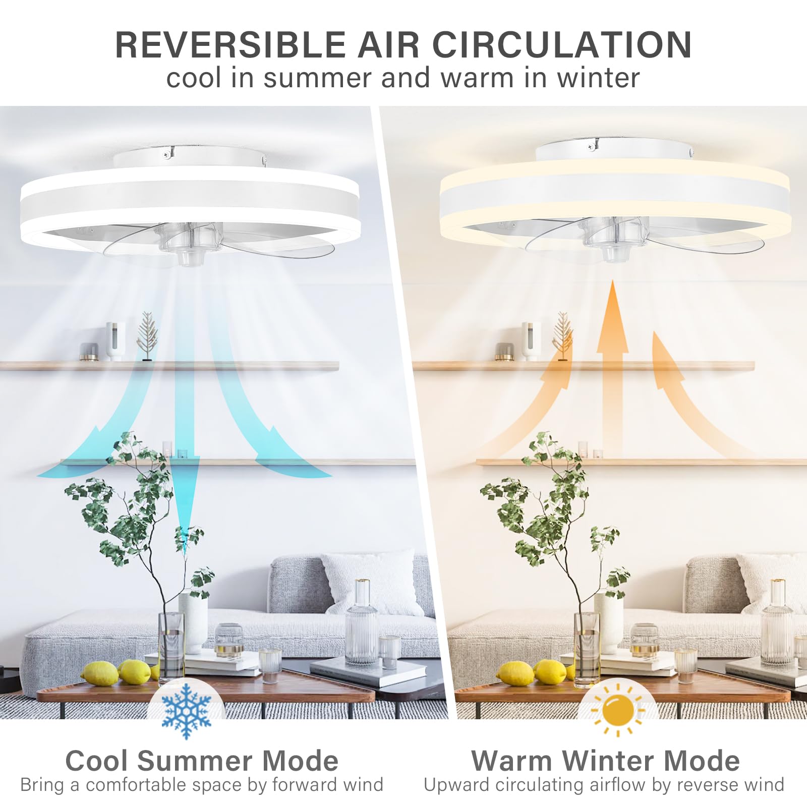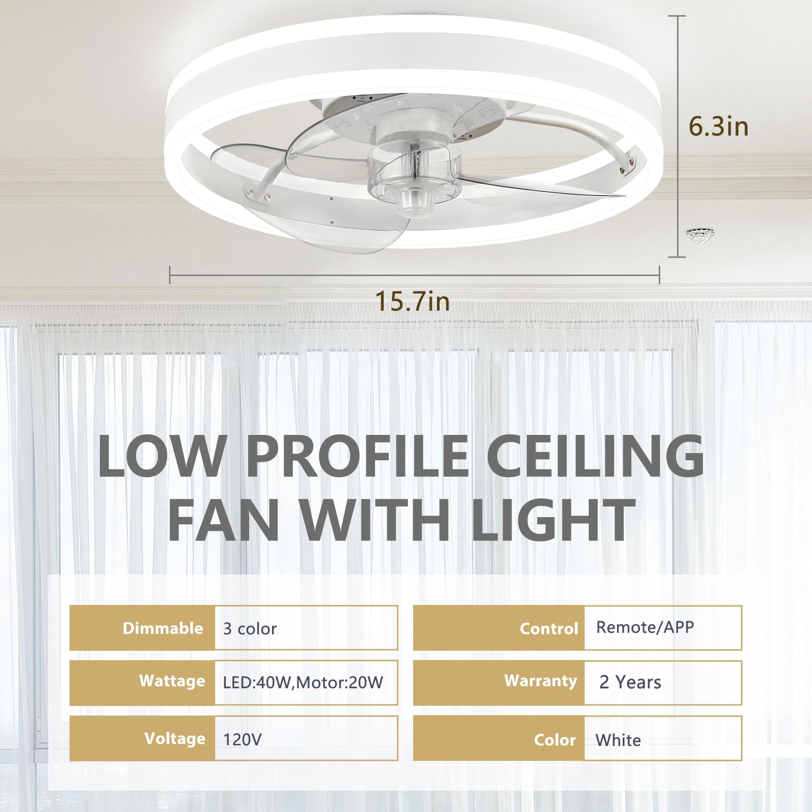 - Modern Ceiling Fan with Light: Upgrade DC motor,3 anti wobble fan blades, 15.7" low profile ceiling fan runs smoothly and quietly with strong airflow. Semi enclosed structure keeps you and your family safe from rotating blades. 2 in 1 ceiling fan light design is a great home decor, adds beauty to the rooms. Ideal for small rooms with low ceilings and elevated beds, fully saving space for you