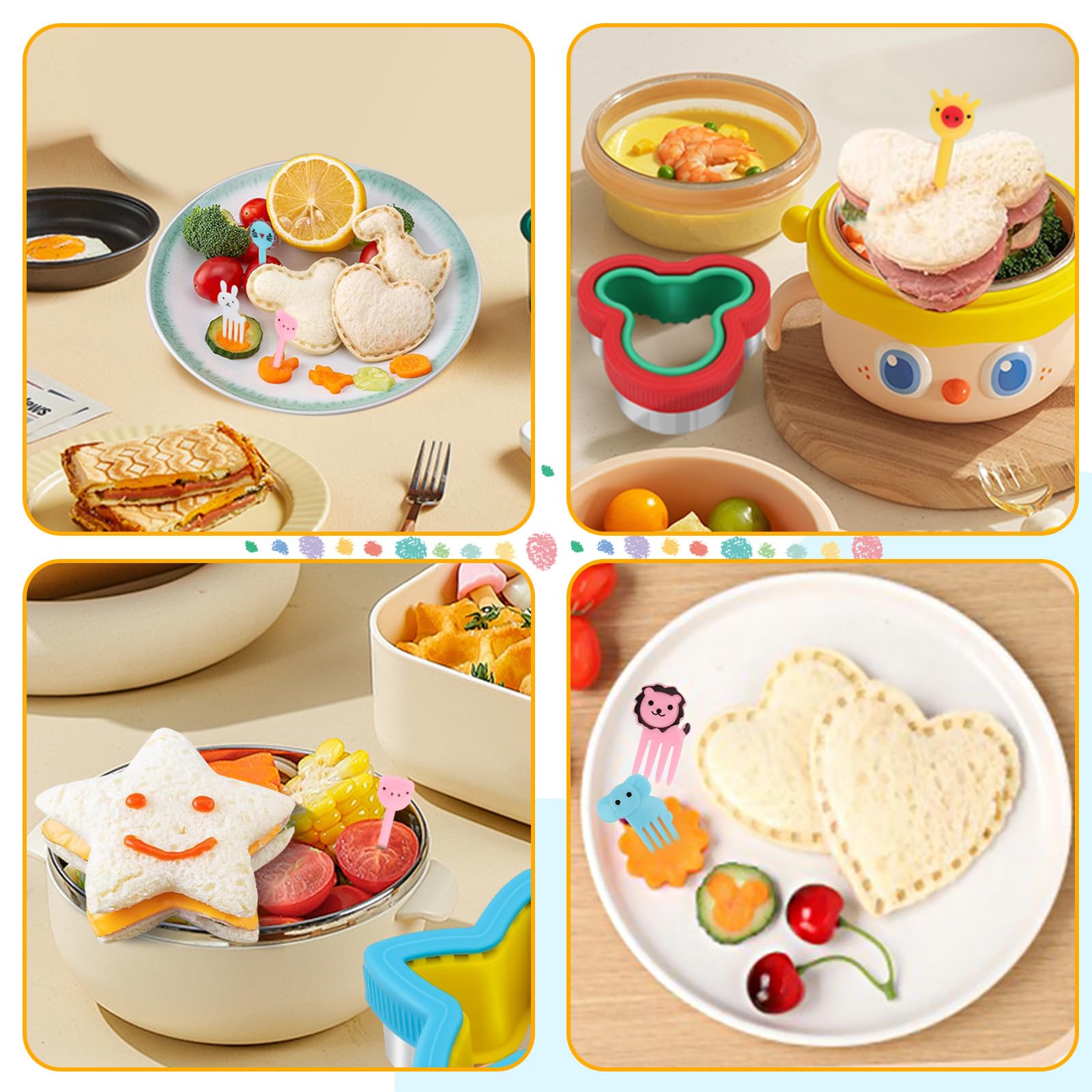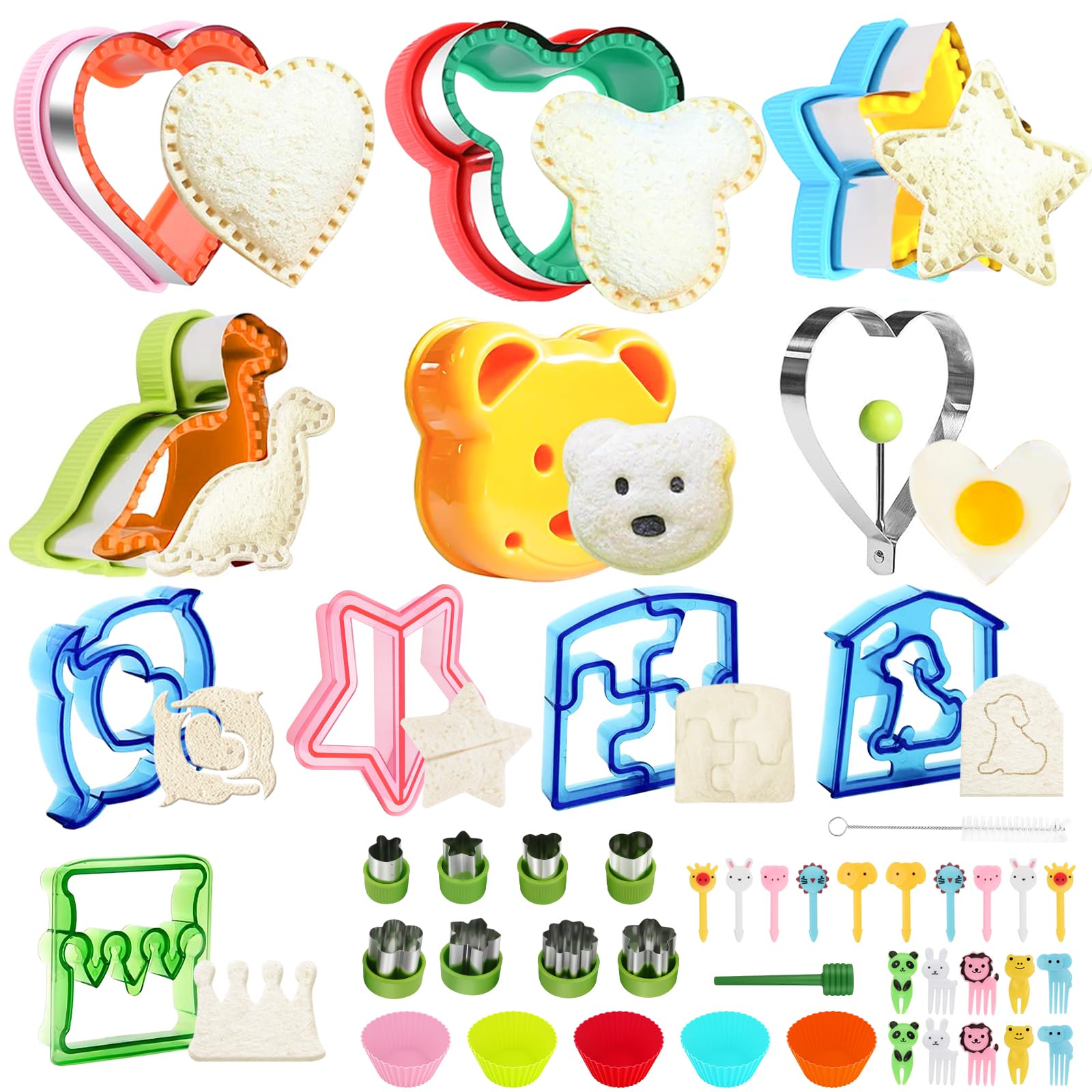 - 【48PCS SANDWICH CUTTER SET】 Our sandwich cutter and sealer set include 4 large-shaped molds: dinosaurs, stars, hearts, mice, 1 bear mold, 2 sandwich molds: square and triangle, 1 heart-shaped omelette, 8 fruit cutters, 10 fruit forks, 10 fruit picks, 5 colored baking cups, 5 bread cutters: dinosaurs, puppies, crowns, hearts, five-pointed stars, 1 honey stick and 1 small brush. Enjoy time in the kitchen with your children and make fun lunches together!