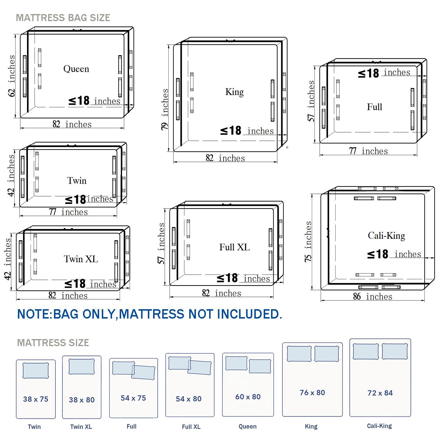 Details: Twin Mattress Bag with Handles for Moving and Storage,Heavy Duty Extra Thick Mattress Storage Bag with Zipper Closure to Prevent Rips,Made of New Material. Size: QUEEN --- 82'' L x 62'' W x 15'' D KING --- 82'' L x 79'' W x 15'' D FULL --- 77'' L x 57'' W x 15'' D FULL XL--- 82'' L x 57'' W x 15'' D TWIN --- 77'' L x 42'' W x 15'' D TWIN XL -- 82'' L x 42'' W x 15'' D CALIFORNIA KING -- 86'' x 75'' x 15'' D CRIB --- 54'' L x 29'' Wx 6.5'' D