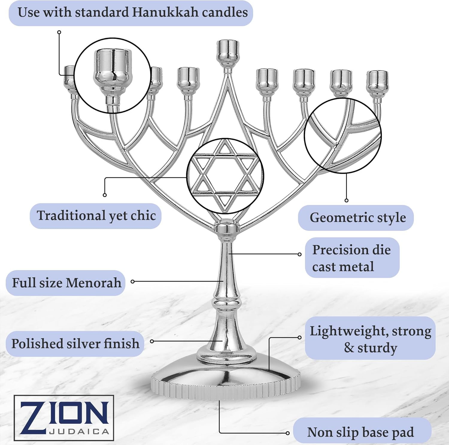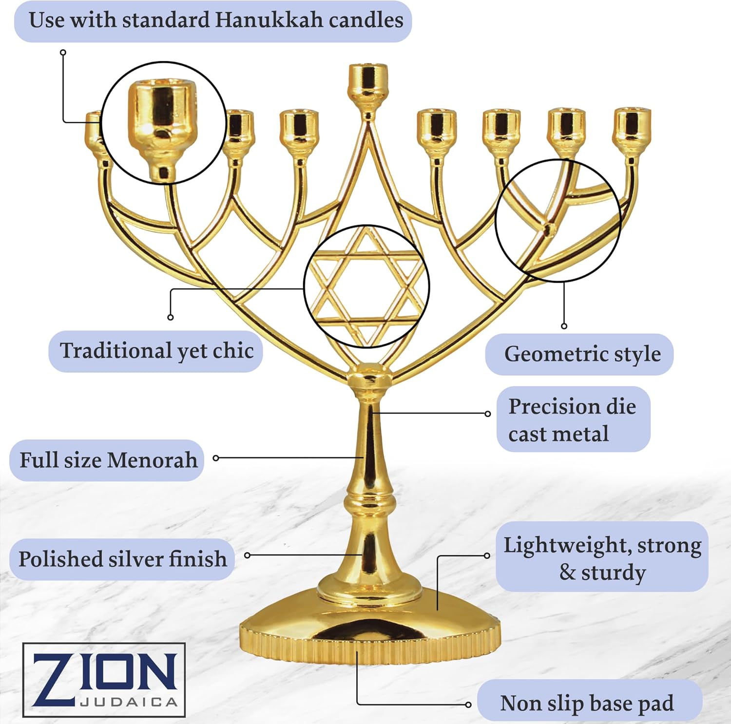- For the Festival of Lights – Adorn your home with a gorgeous Hanukkah menorah from Zion Judaica. Enjoy a classic geometric look, diecast with a modern sleekness that carries tradition to the future.