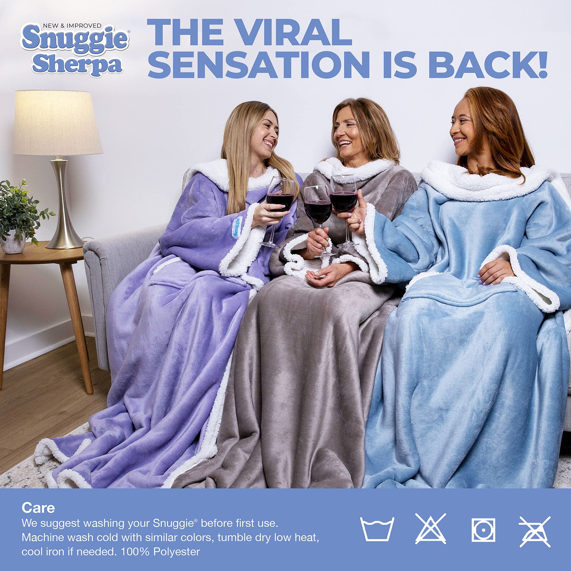 - SNUGGIE SHERPA- A functional wearable blanket, built for relaxation. Keeps you warm whether you are watching TV or reading a book. The kangaroo pocket keeps your devices handy, while the sleeves leave your hands free to flip the page or change the channel! A supersoft velveteen outside and sherpa inside to keep you warm and cozy while lounging.
