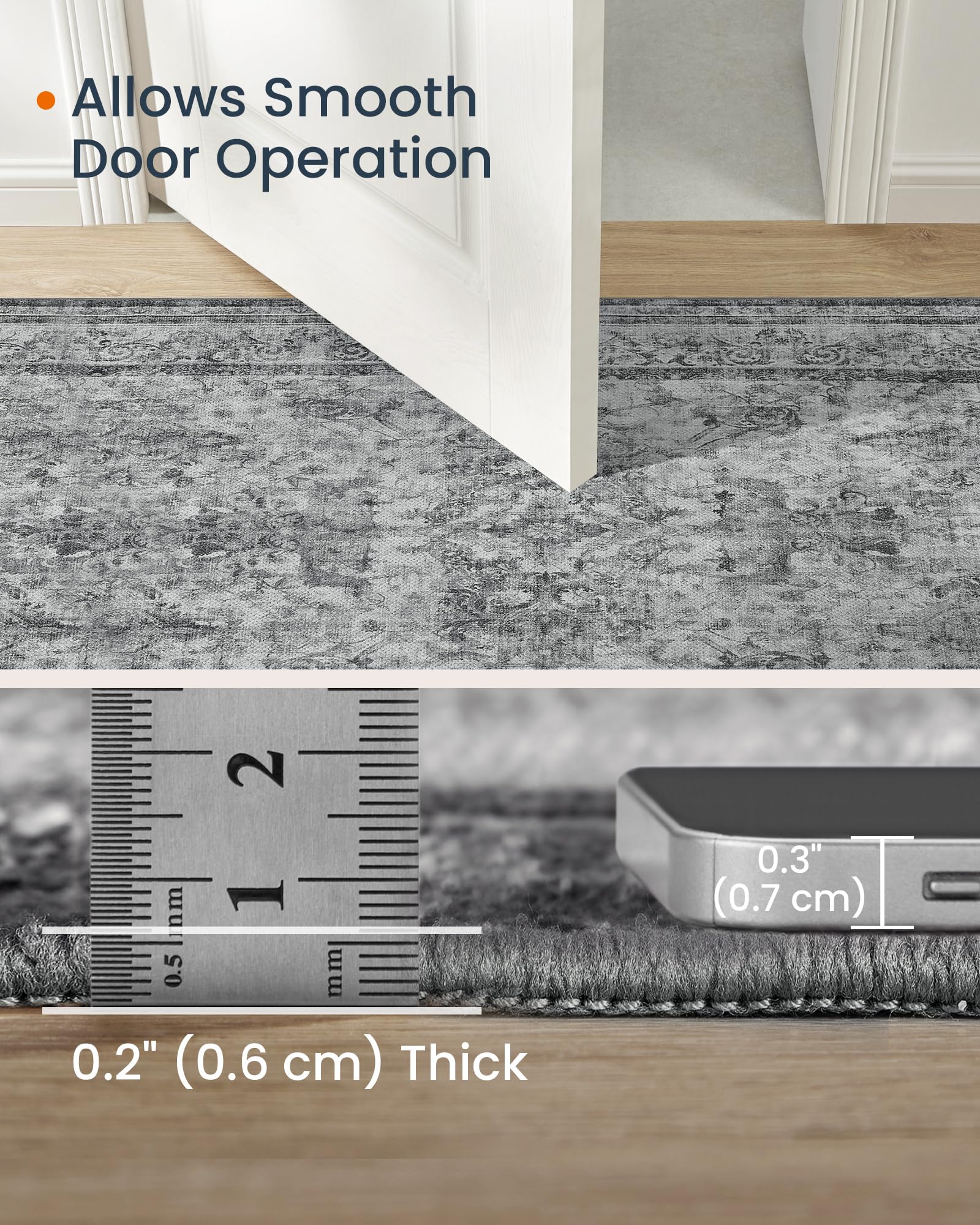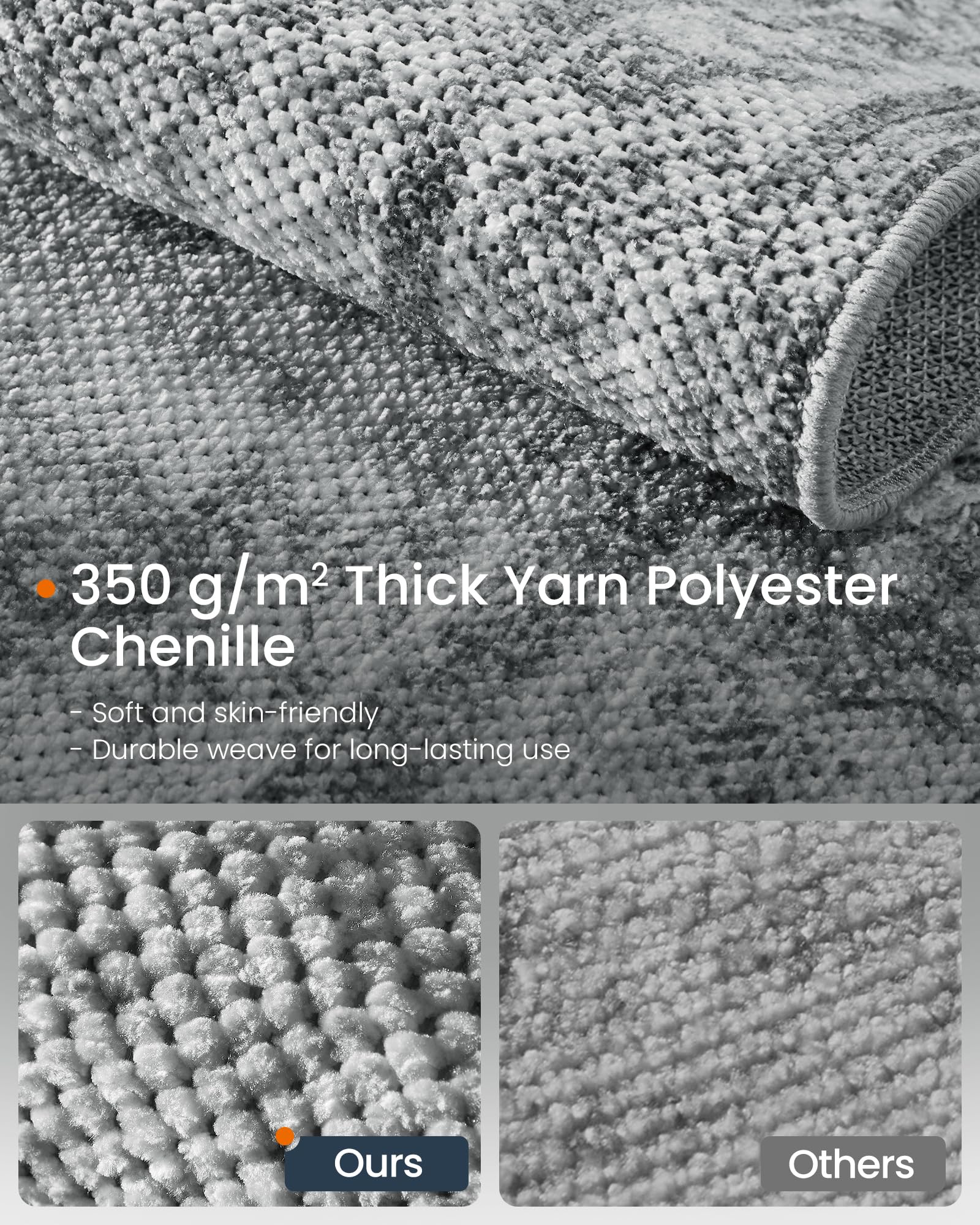- 【SOFT, DURABLE, AND DOOR-FRIENDLY】Crafted from 350 g/㎡ thick yarn polyester chenille, our bedroom rug offers a skin-friendly feel and a durable woven texture. Its 0.2" thickness ensures smooth door operation, making it ideal for high-traffic areas