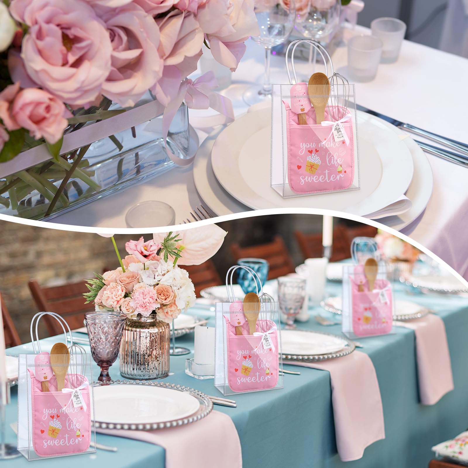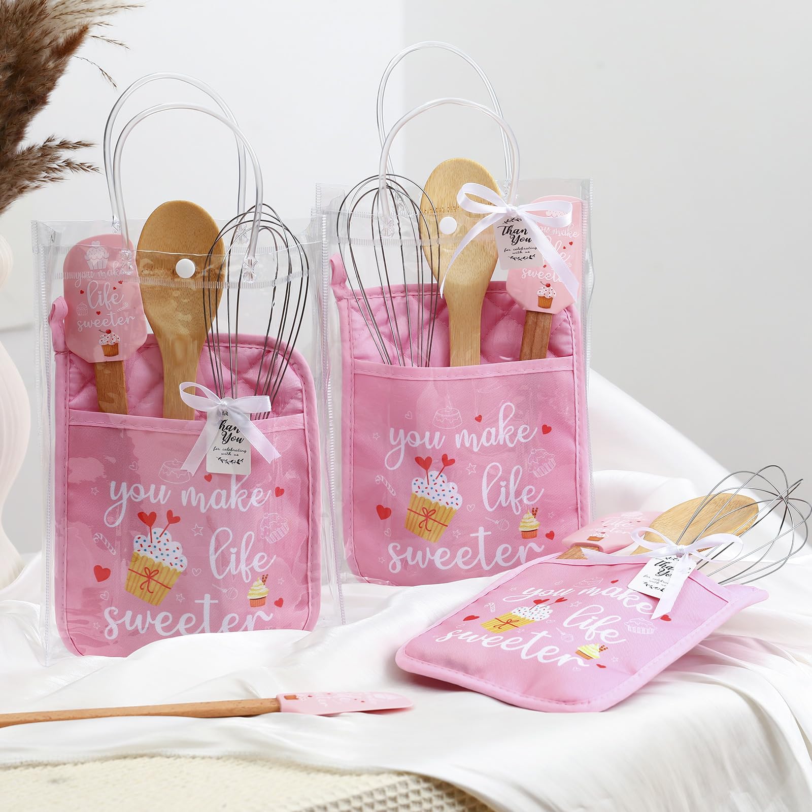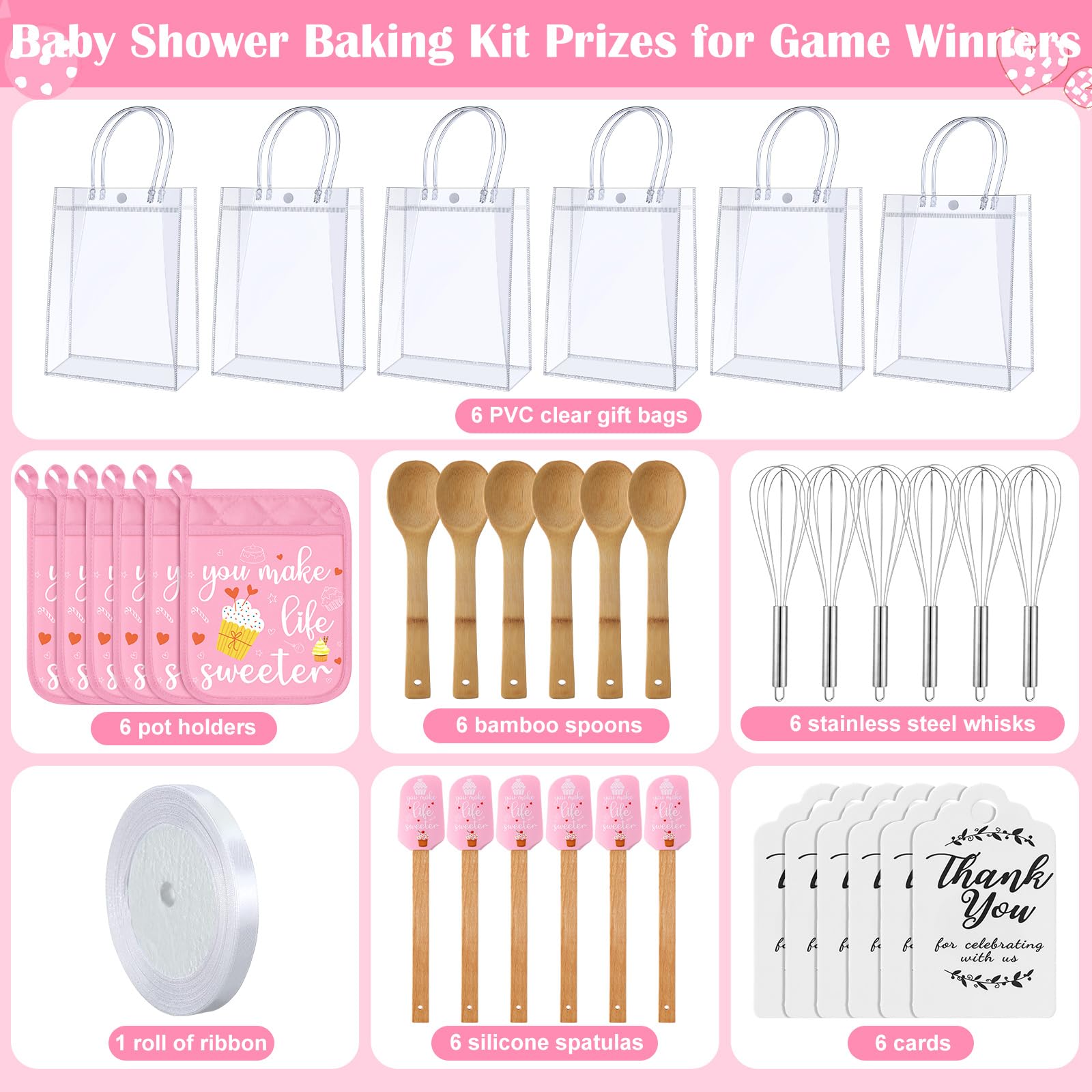 - Practical Set: baby Shower Prizes for Game Winners set includes 6 insulation mats, 6 silicone spatulas, 6 round spoons, 6 egg beaters, 6 cards, 6 gift bags and 1 roll of ribbon, featuring [ You make life sweeter] wordings and patterns on the polyester pot holders and silicone spatulas, expand your baby shower games gifts to a whole new level with vibrant, artistic elements