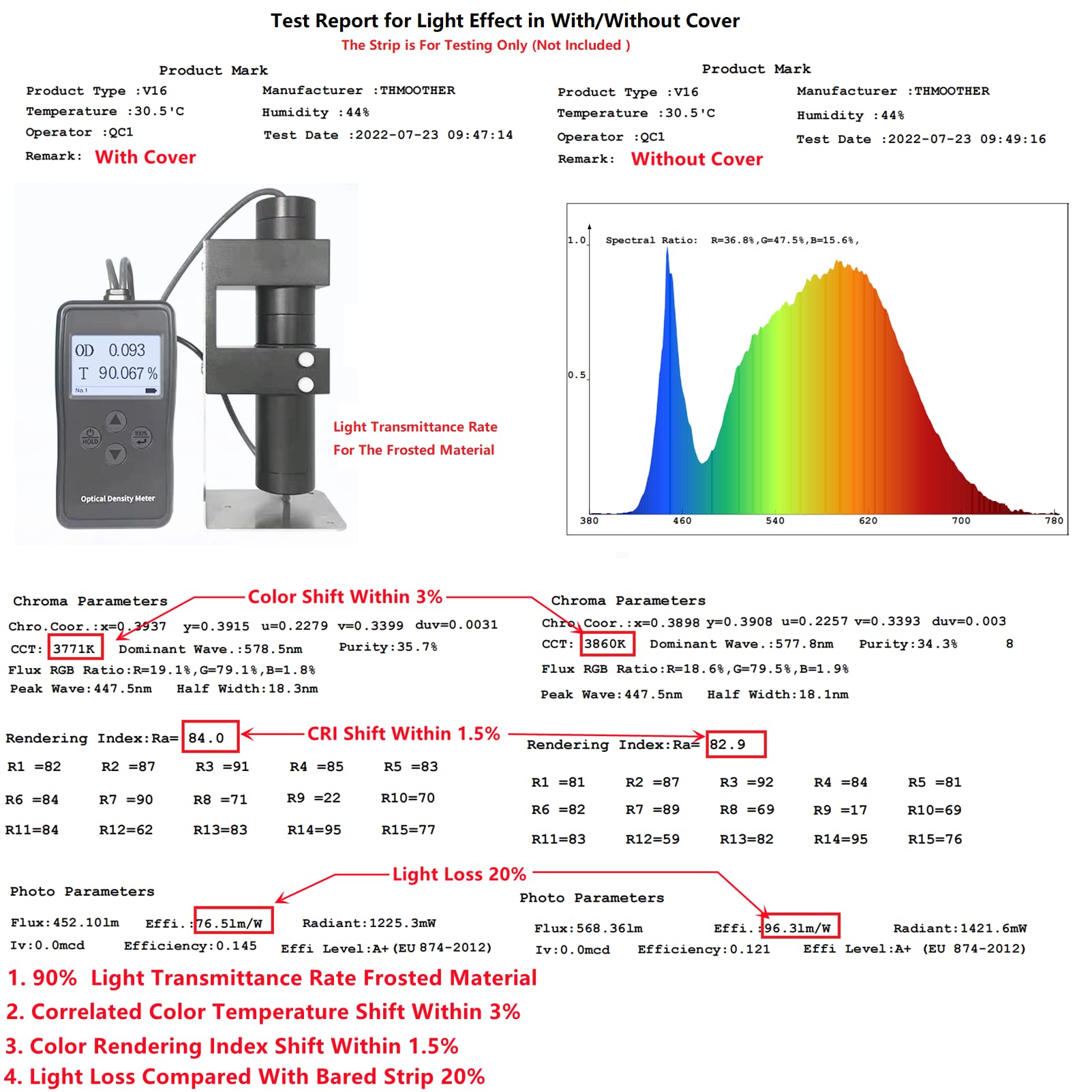 - Thickening Translucent Cover with UV Protection Material Result a Stable And Anti Yellowing Performance in Outdoor Environment With IP Rated Strip, the Diffuser Even And Smooth Out The Lights Well Without Color Shift, 90% Transmittance Rate