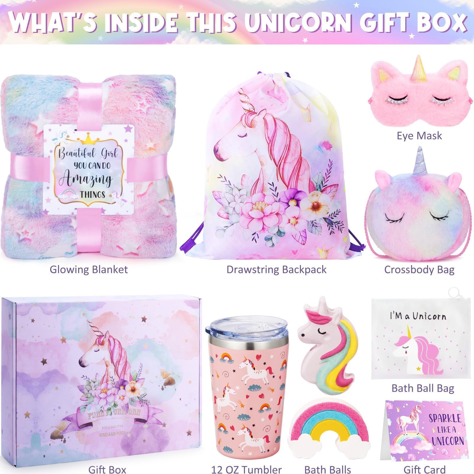 • 9PCS UNICORNS GIFTS FOR GIRLS: Tiblue Unicorn Gift Box is a special & magical gift for 3-12 years old toddler teen girl, gift for daughter granddaughter niece, including glow in the dark blanket, 12 oz tumbler, drawstring unicorn backpack, plush crossbody purse, 2 bath balls, unicorn eye mask, gift card & gift box. Our girls unicorn birthday gift box contains all fun & carefully designed items to surprise your princess. WARNING: CHOKING HAZARD- Small parts. Recommended Age Grading: 3+ years old