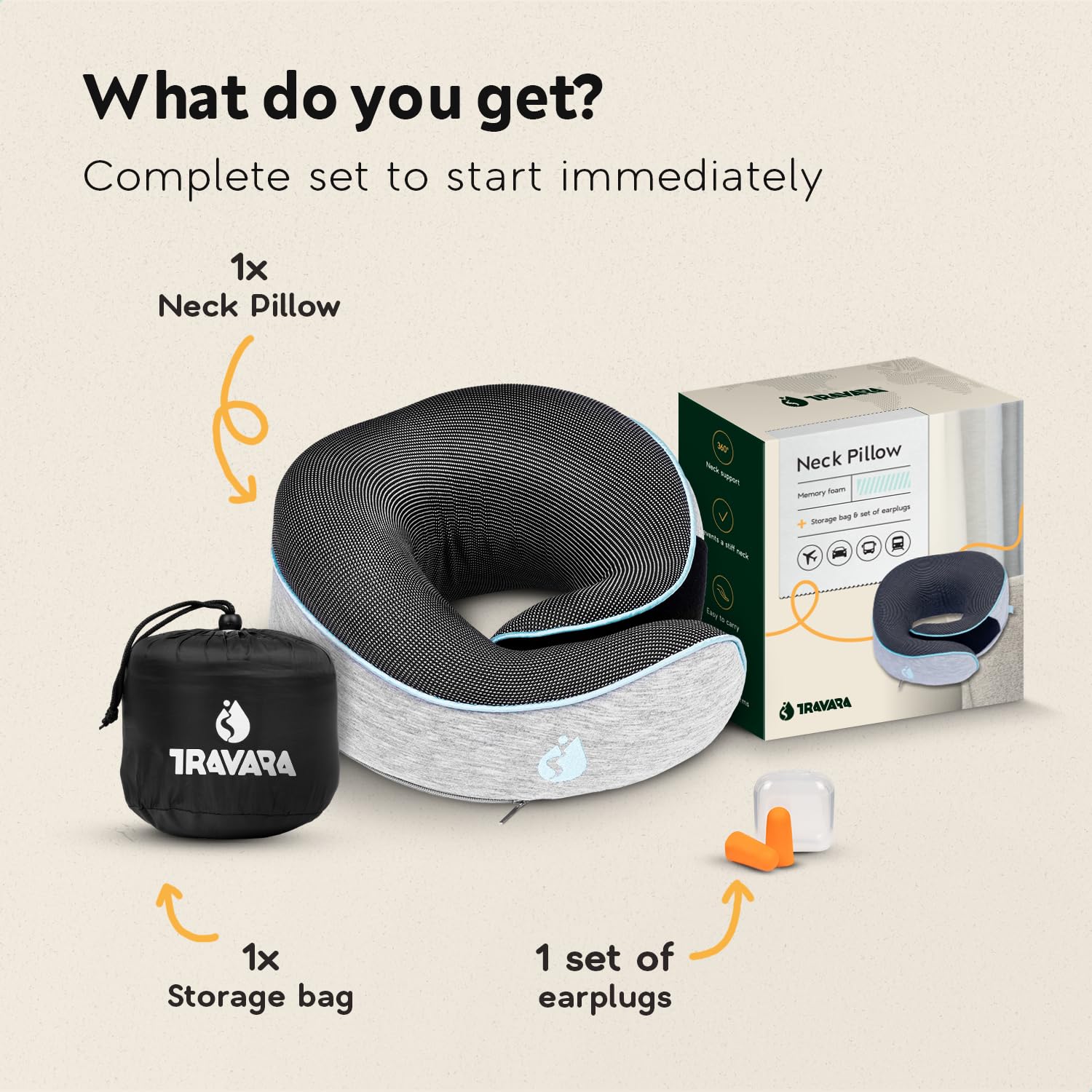 TRAVARA Neck Pillow Airplane - Travel Neck Pillow - Airplane Pillow with 360° Memory Foam Neck Support - Travel Pillow for Sleeping - Travel Pillows for Airplanes
