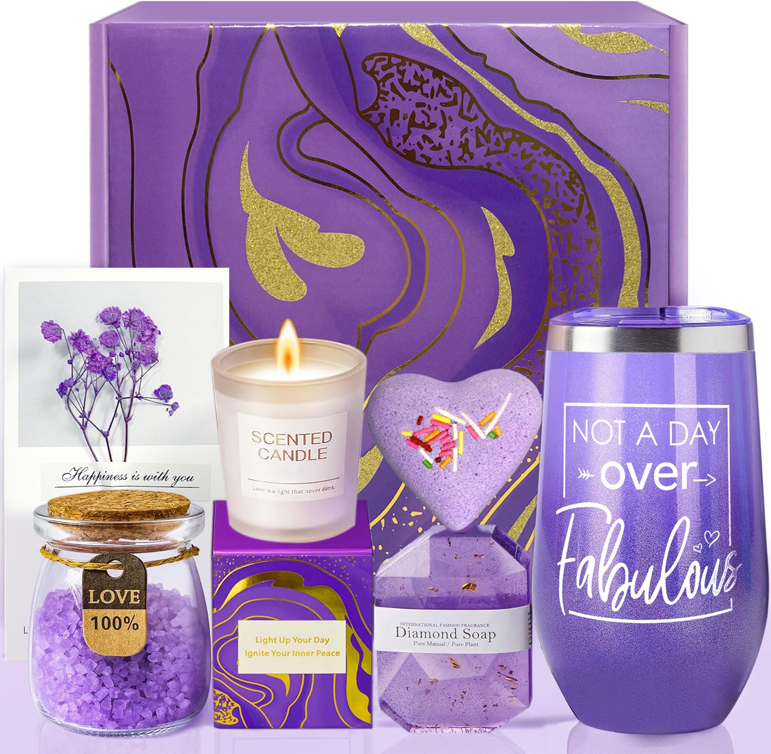 - 7 PCS Gift Set for Women: This Blissful Ocean SPA gift basket has everything she needs, including Our luxury 6-Piece Gift Baskets include six beautifully packaged items - a 20 oz insulated Stainless Steel Tumbler with "Not A Day Over Fabulous" engraved on it, a Bath Bomb, a Bath Salt, aromatherapy Candle, a pure handmade diamond soap and a lovely Dried Flower Greeting Card, heartfelt touch. Made from premium stainless steel with double-walled vacuum insulation, this tumbler ensures drinks stay at the perfect temperature, whether hot or cold.