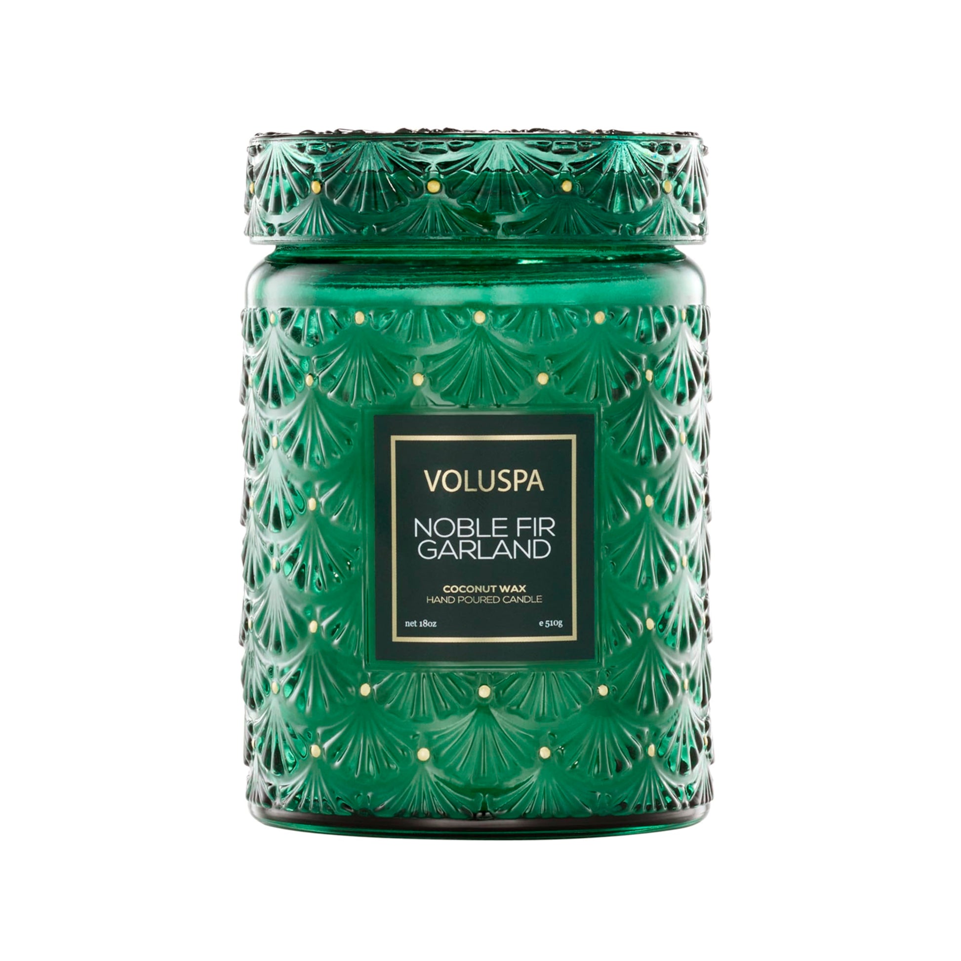 Voluspa Noble Fir Garland, Large Candle Jar, 18oz, Coconut Wax Blend, Christmas Scented Candles for Home, 100 Hour Burn Time, Handcrafted in The USA