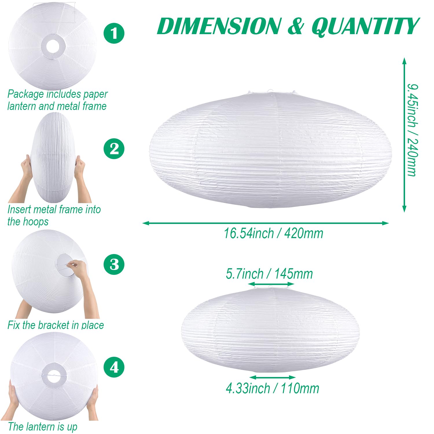 - [Better Quality Material]- Our white oval paper lanterns are made of high quality rice paper and sturdy metal supports, handmade, foldable, and easy to store and use many times. You can put a light inside the lantern (LED light NOT included). It is easy to assemble and extremely easy to disassemble