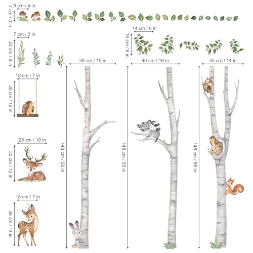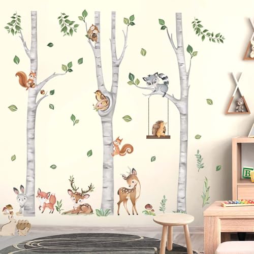 wondever Large Birch Tree Animals Wall Stickers White Tree Forest Owl Fox Deer Peel and Stick Wall Art Decals for Baby Nursery Kids Bedroom Living Room (H:160cm)