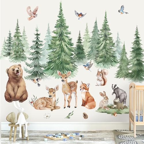 wondever Large Pine Tree Animals Wall Stickers Woodland Animal Bear Deer Fox Peel and Stick Wall Art Decals for Baby Nursery Kids Bedroom Living Room